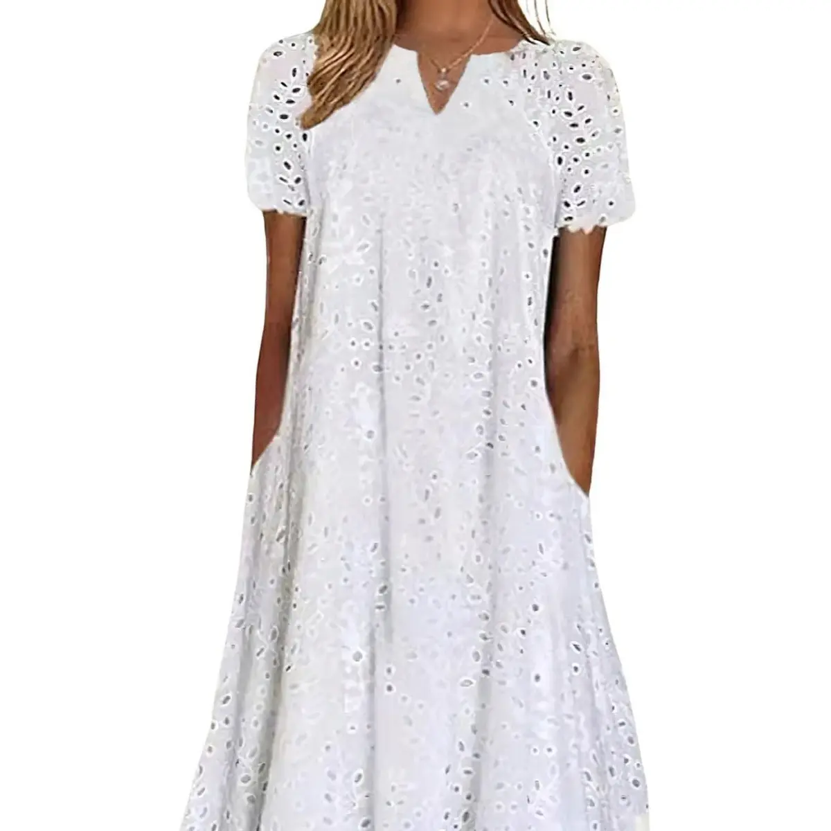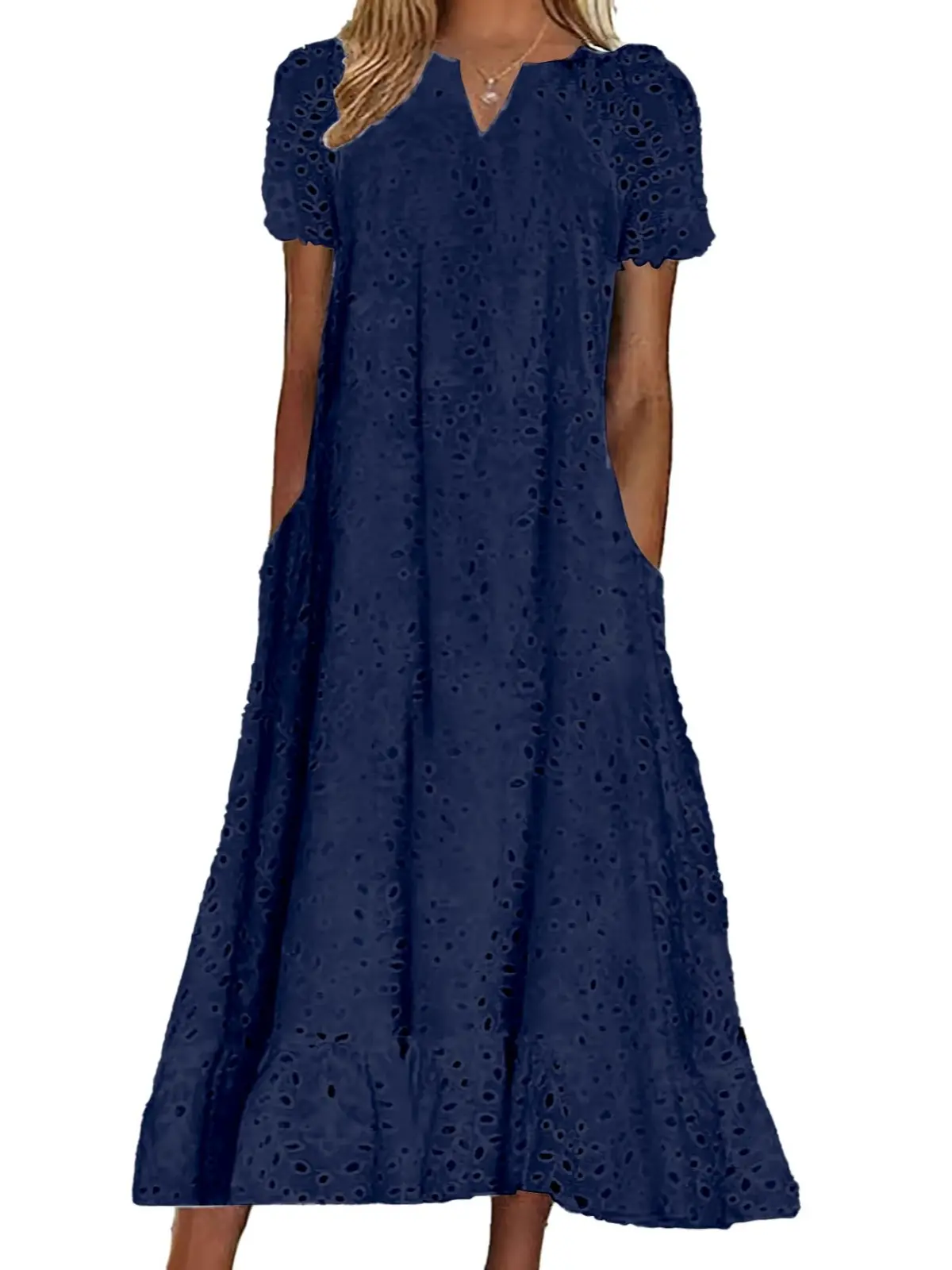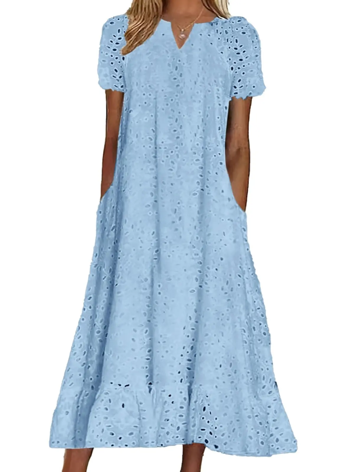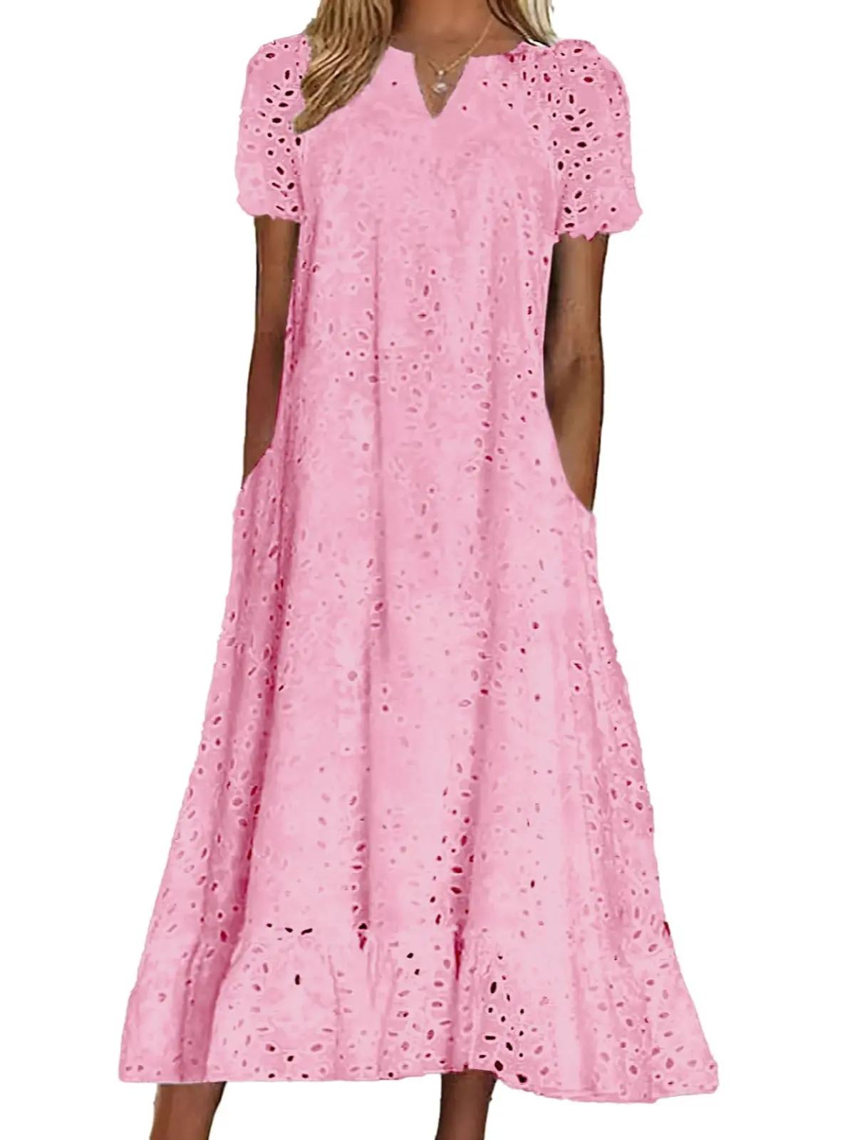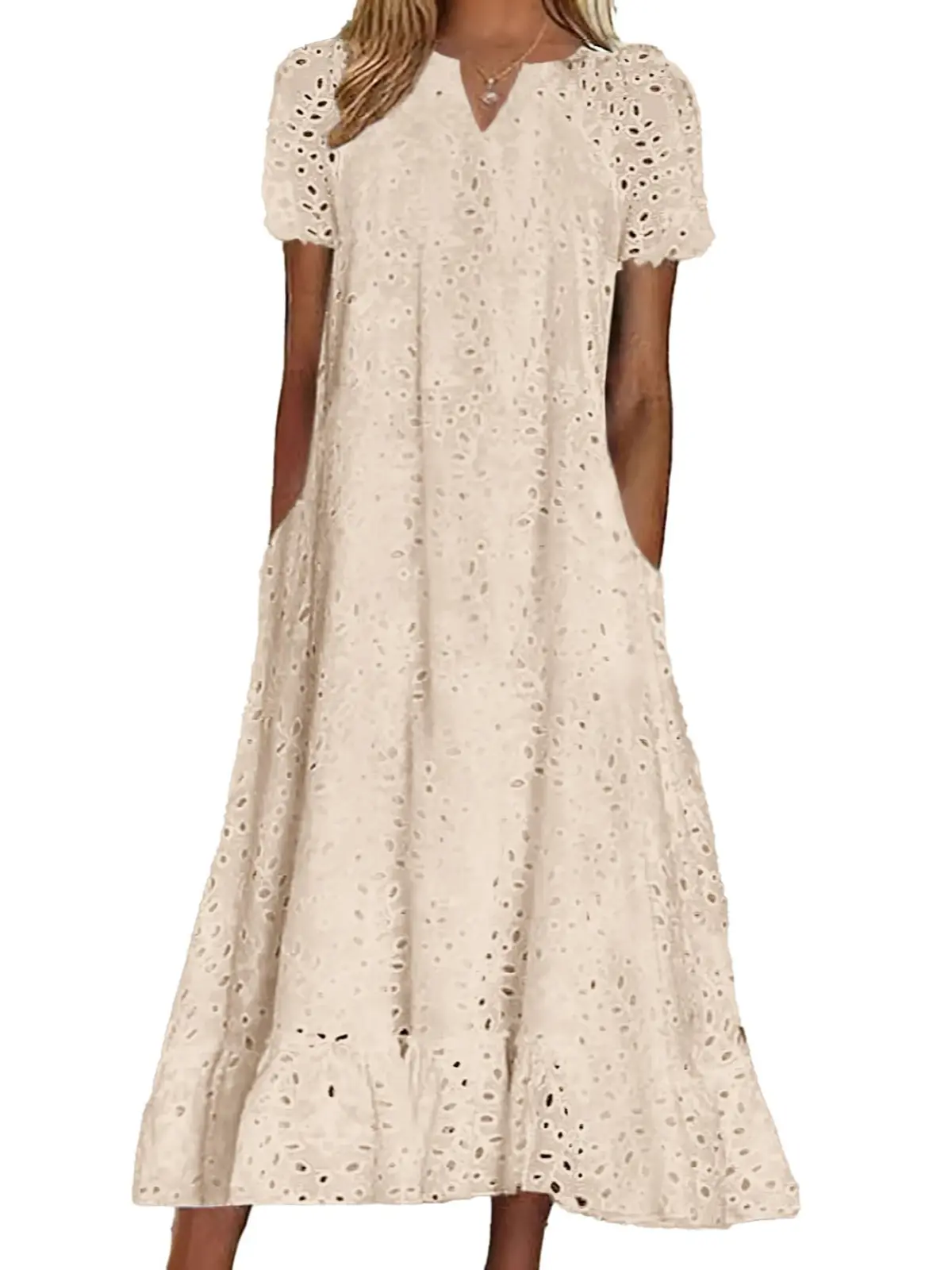 ·Midi long eyelet lace dress with pockets, featuring hollow out floral embroidery, classic a line flare silhouette with ruffled flounce hem, short sleeve, below the knee length.