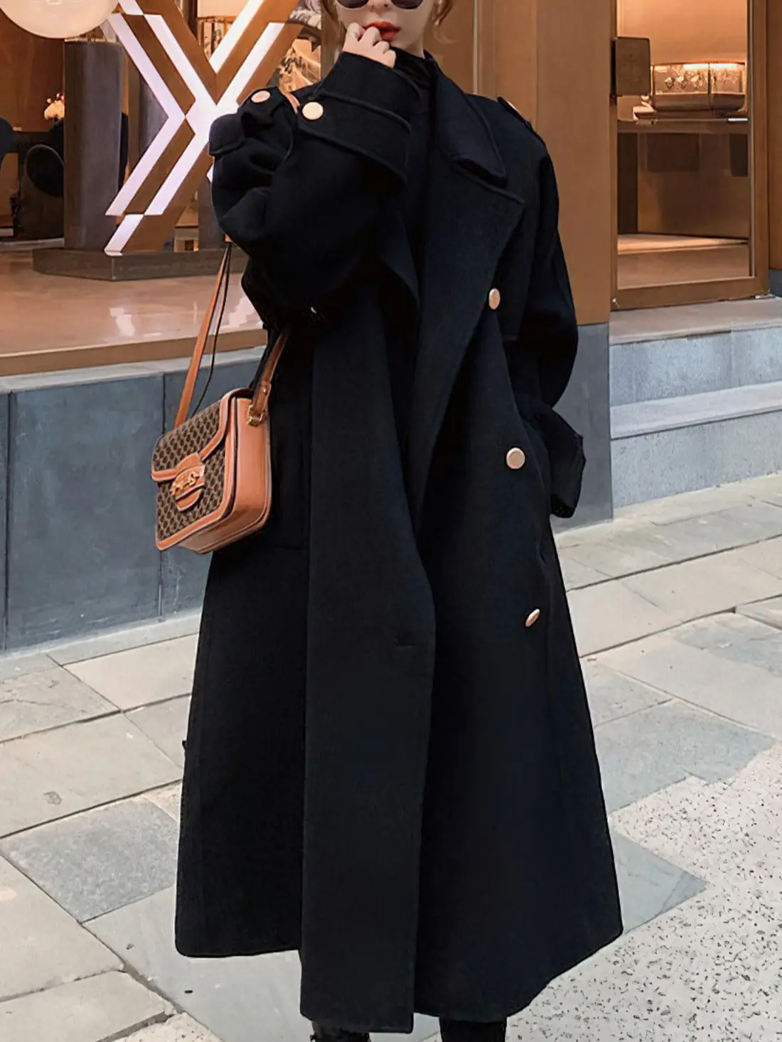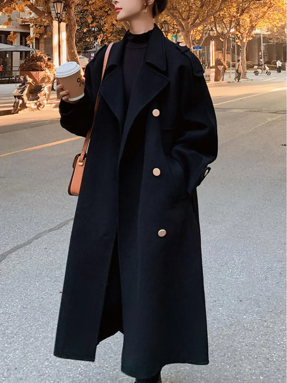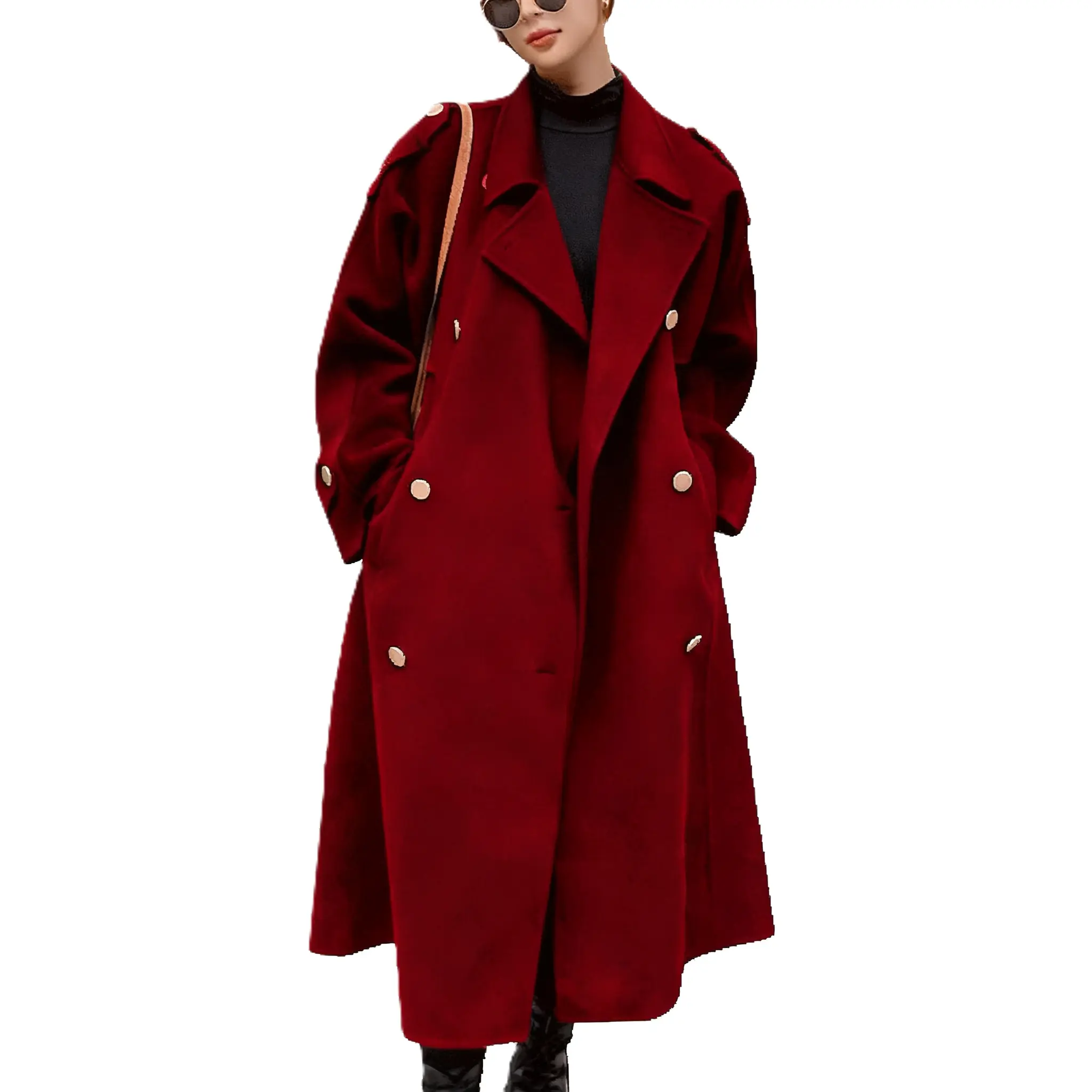 ·Midi long wool coat for women featuring double breasted button down placket, classic notch lapel, long sleeve with buttoned cuff, drop shoulder with epaulets, back flap and split, below knee length,