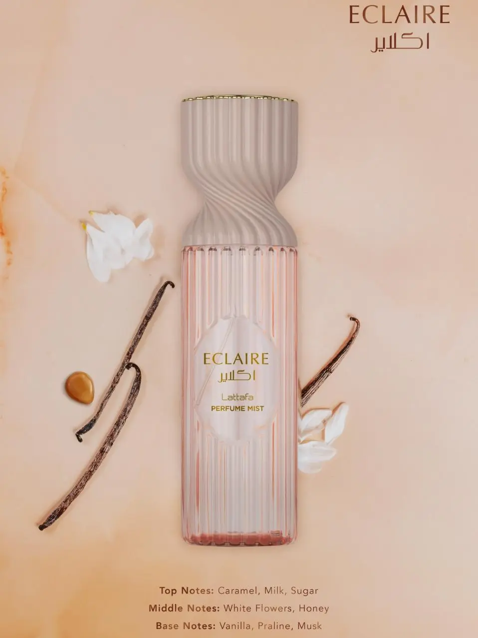 Eclaire opens with playful sweetness, flows into a creamy caramel-vanilla heart, and dries down to a warm, clean musky base that lingers softly.