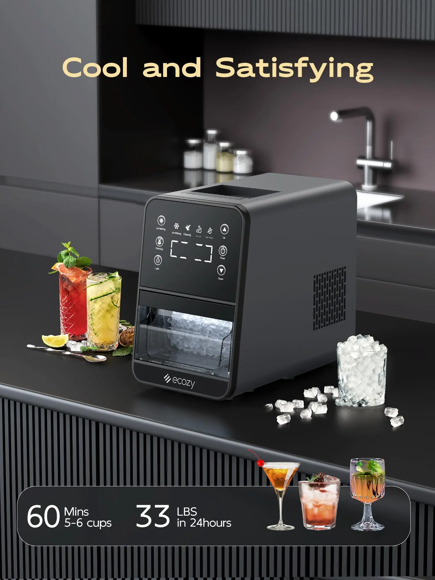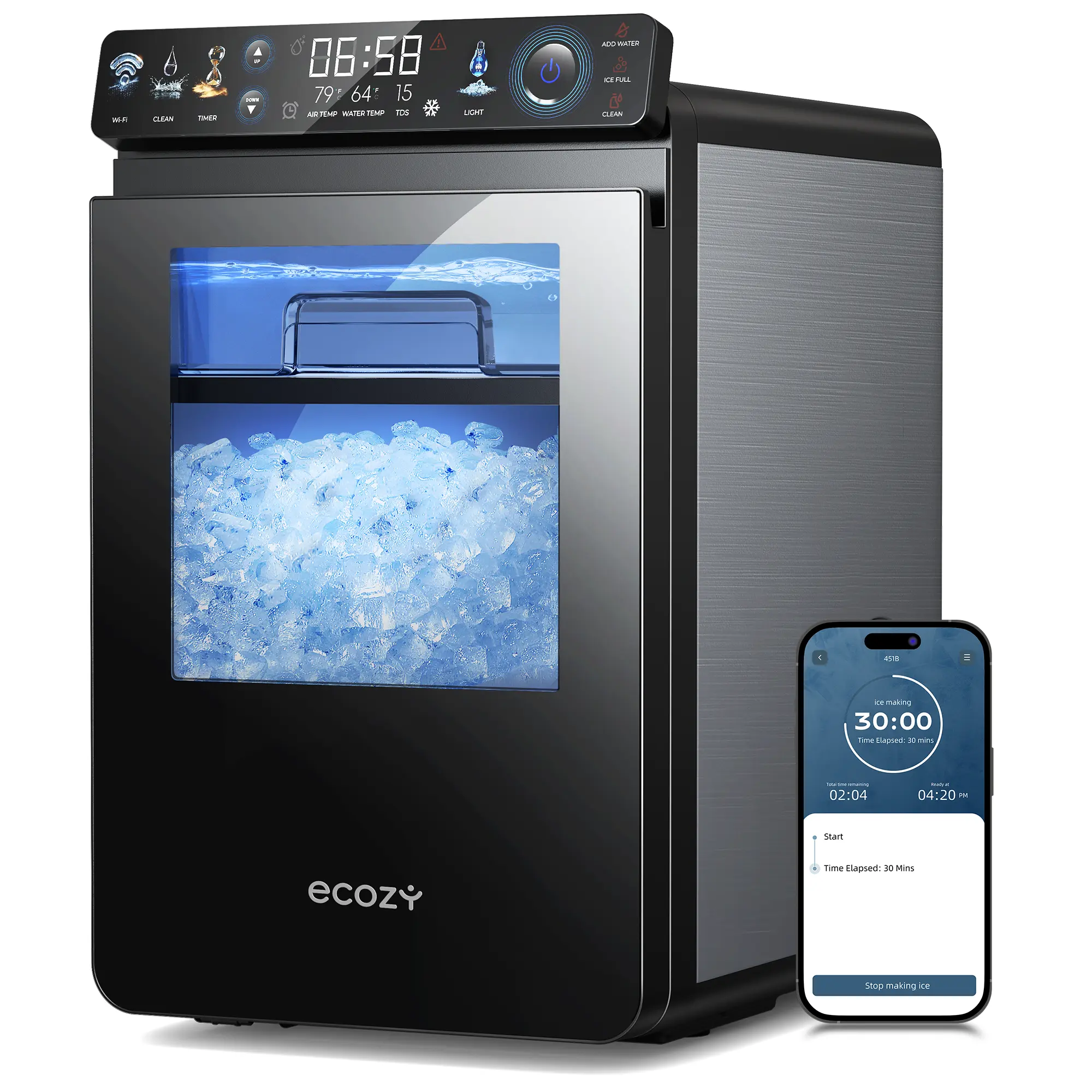 The ecozy Nugget Ice Maker features an intuitive Ergonomic EcoScreen with a One-Touch Timer, ensuring smooth operation. Its slanted touch design offers high-resolution visibility, enhancing user experience. The sleek, ergonomic build ensures smarter ice-making. This ice maker is perfect for those seeking a user-friendly interface.