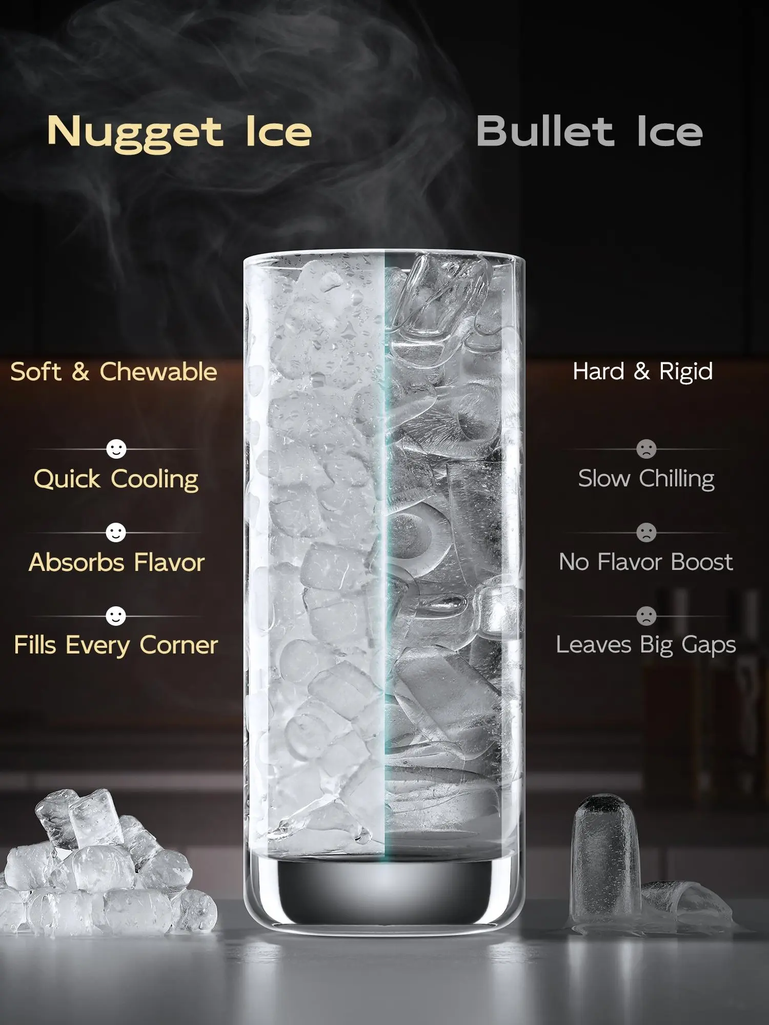 Experience soft, crunchier cylindrical ice that's denser and lasts longer. It absorbs flavors better than standard nugget ice, making your drinks even more refreshing. This unique ice type adds a delightful texture to your beverages, enhancing the overall drinking experience.