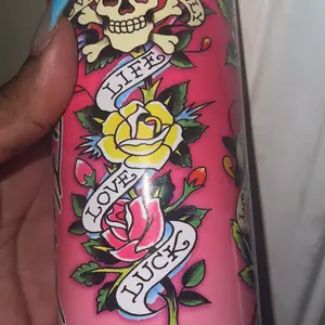 ·Adorned with tattoo-inspired artwork.