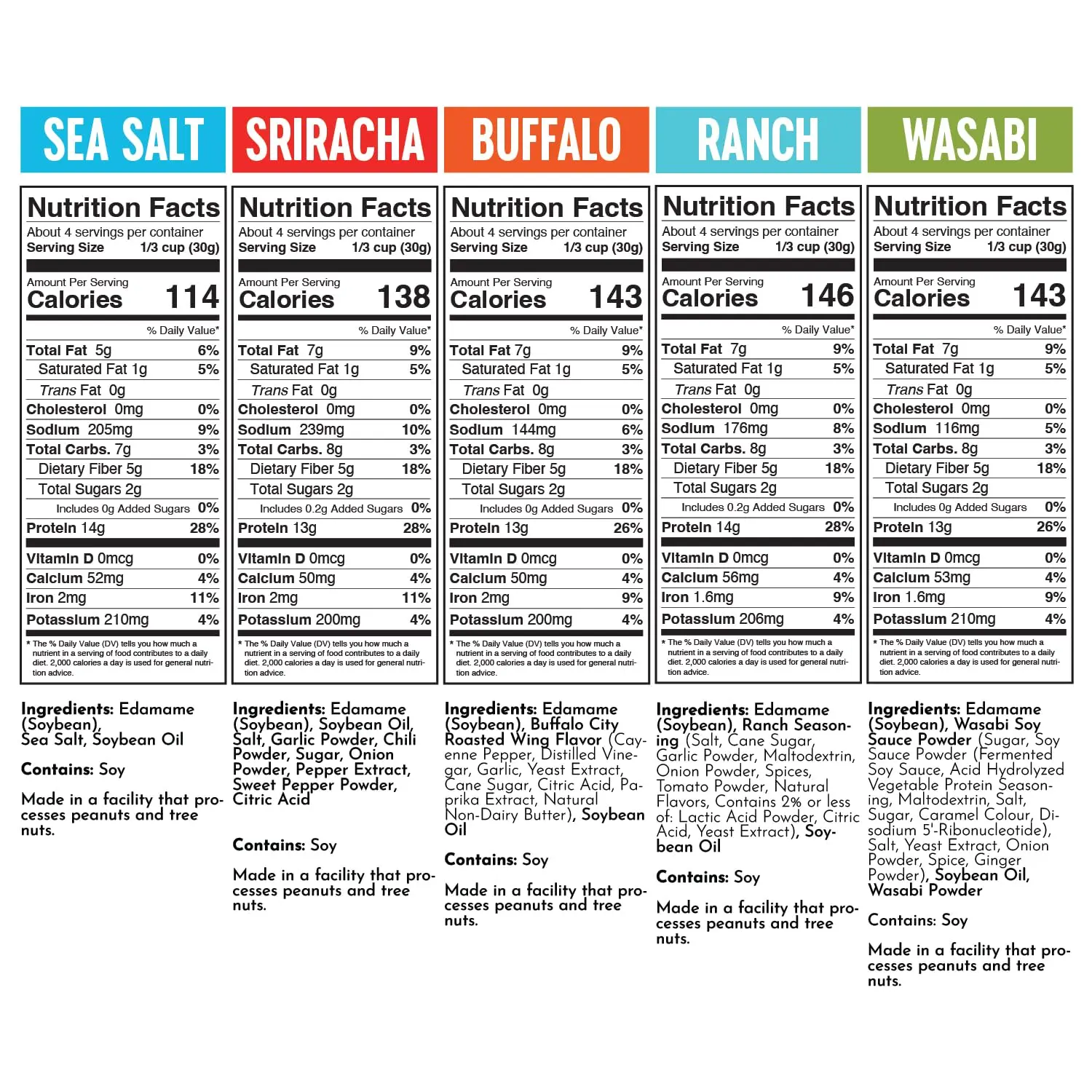These are a great crunchy snack, kind of bland (except the coated flavorings) need a drink with them. Ranch and sea salt are on the tame side. No one in my family liked the buffalo. The sirracha and wassabi were to much for me...but my son in law liked them. He actually ask Me to get more wassabi.