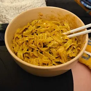 For everyone else, it's like the exact vibe of a whole grain udon noodle texture-wise, but they're flat. I'm obsessed. I've been using them in peanut peanut sauces. They're great chilled.