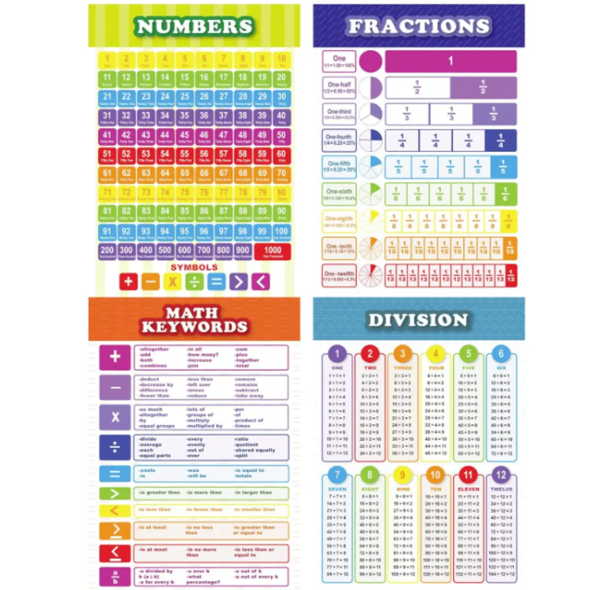 ·WALL POSTERS - 12 Different Math Posters: Addition, Multiplication, Division, Subtraction, Fractions, Numbers, Math Keywords, Shapes, Math Symbols, Roman Numerals, Money, Place Value, Solar System