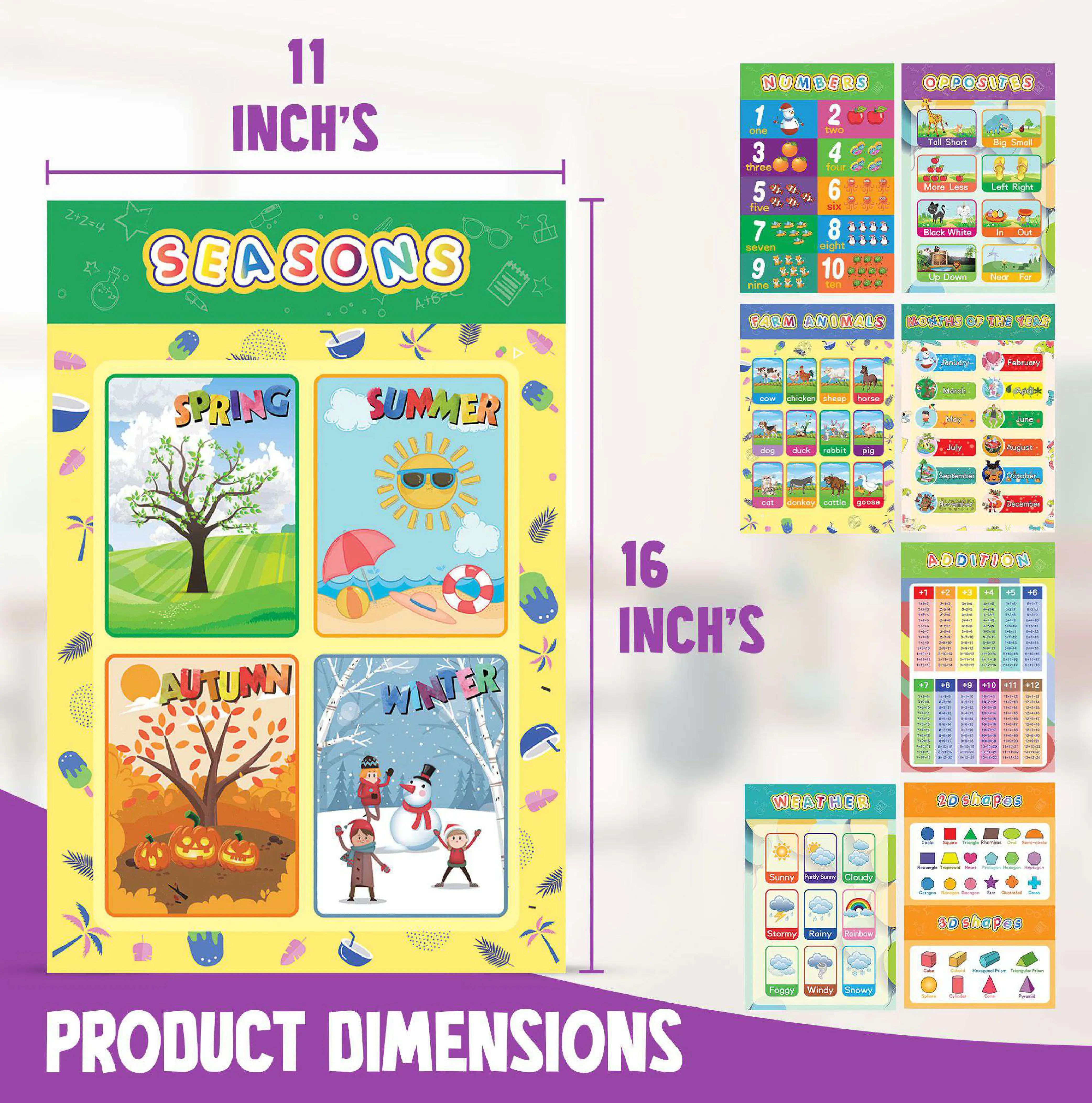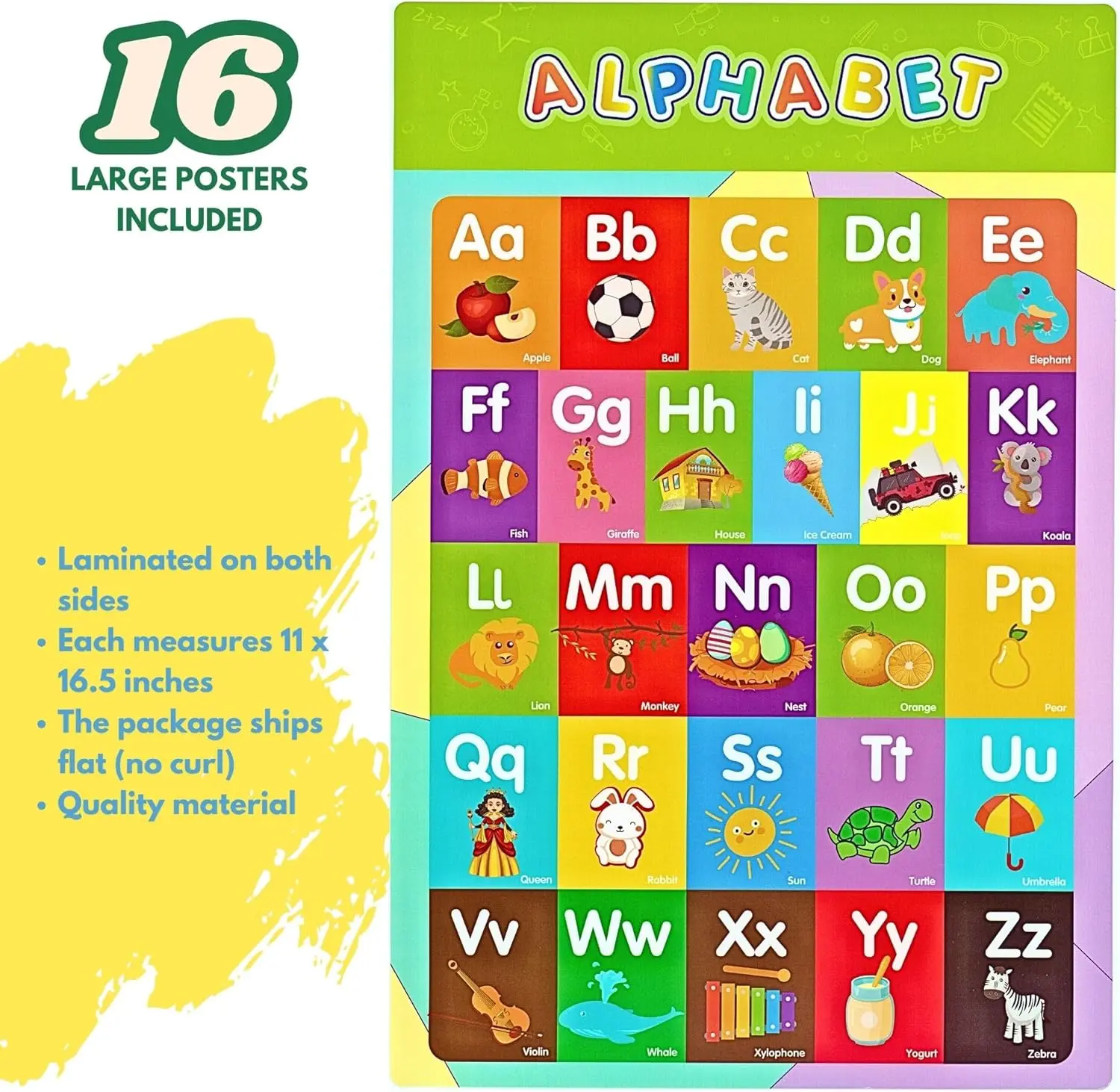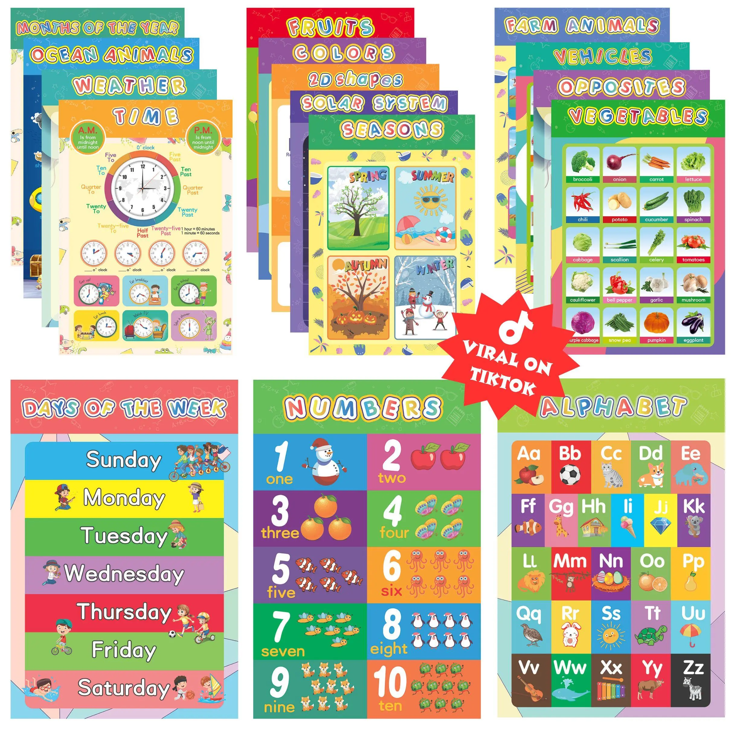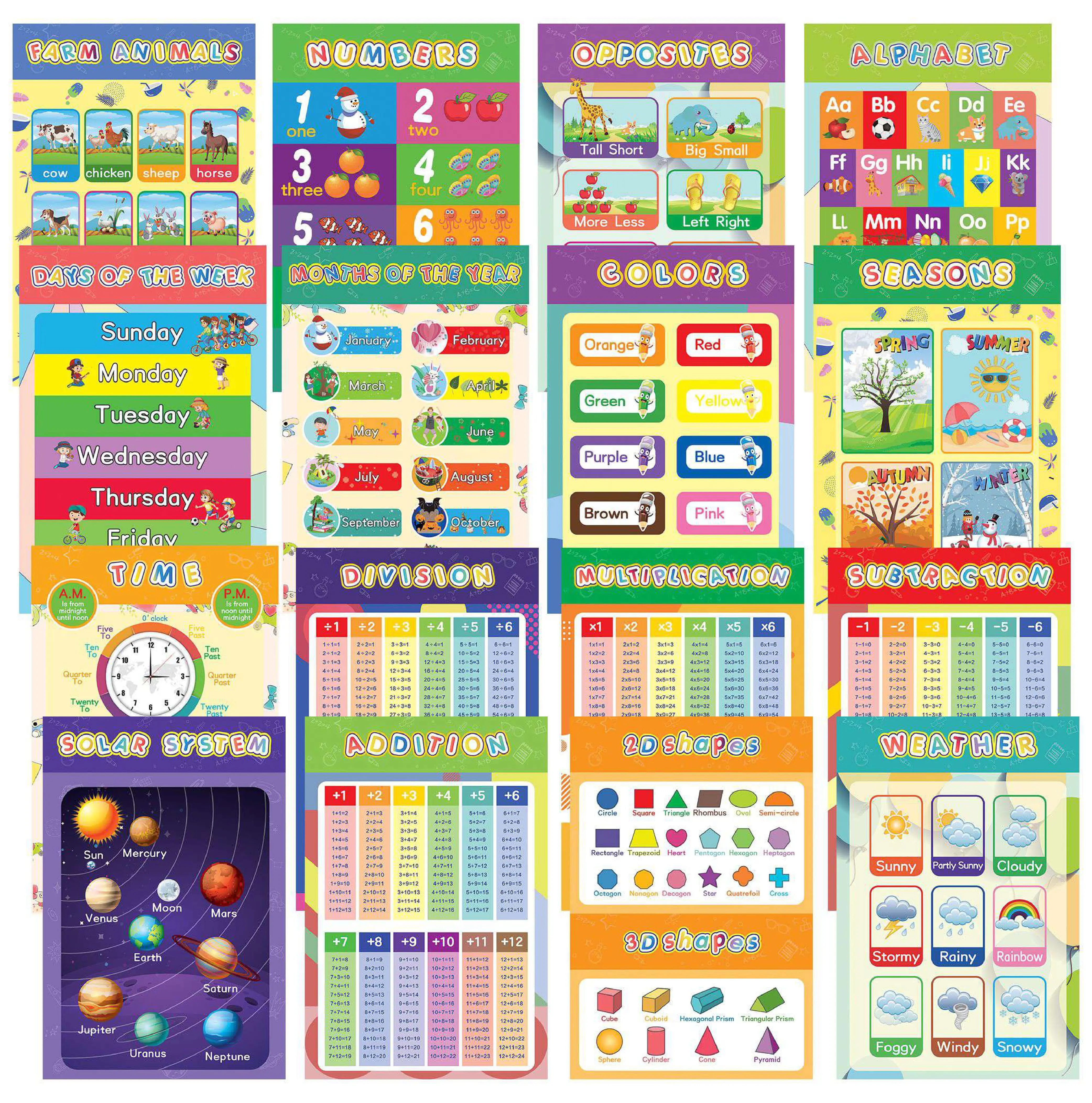·ESSENTIAL MUST-HAVE LEARNING POSTERS FOR KIDS: Encourage curiosity and inspire lifelong learning excitement in your kids and students. This set includes 16 colorful posters covering essential topics for early education: alphabet, numbers, shapes, colors, days, months, time, seasons, farm animals, multiplication, addition, subtraction, division, solar system, opposites, and weather charts.