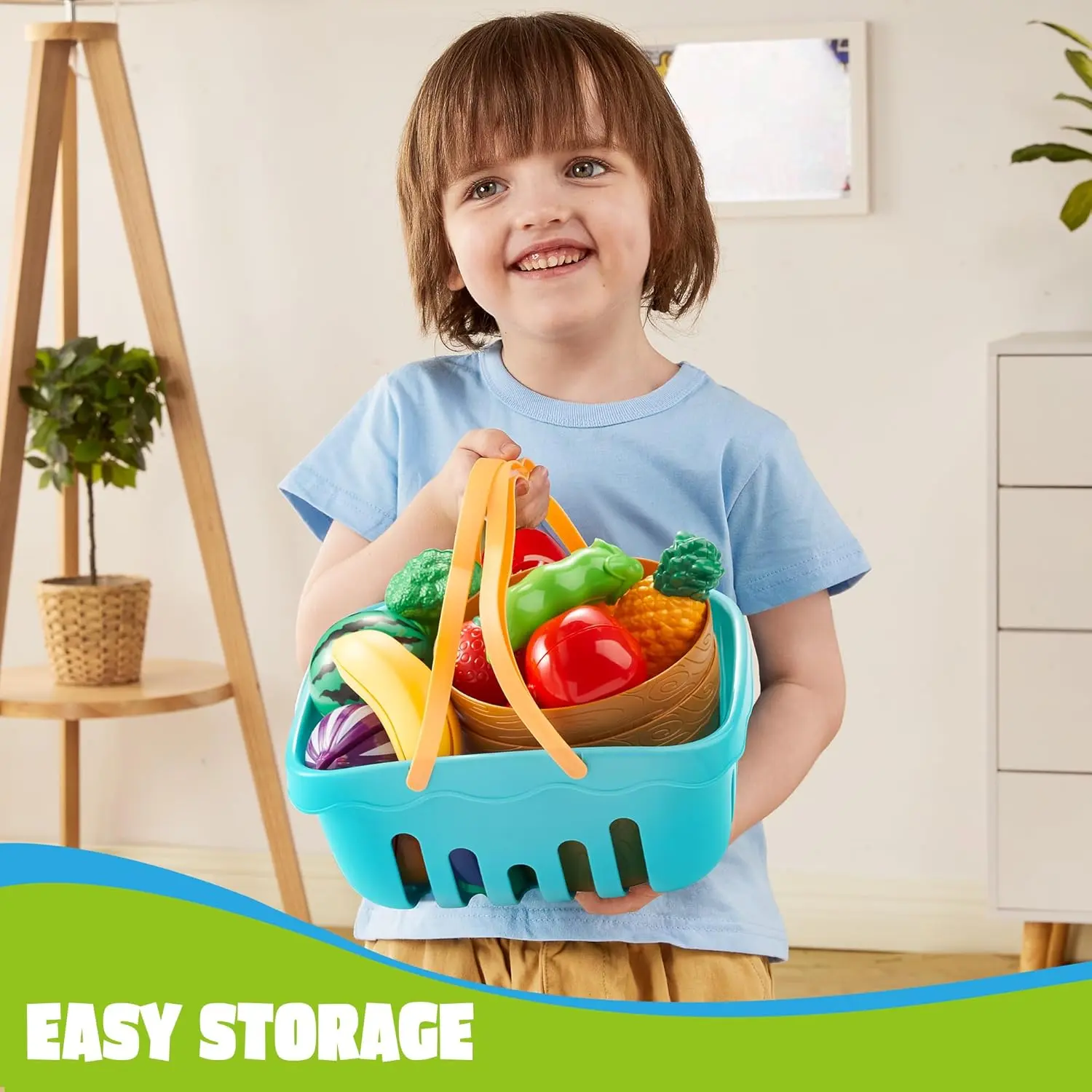 ·Our play food set includes a large storage basket for easy cleanup and organization. It ensures all the play pieces have a home after an engaging play session. 📦