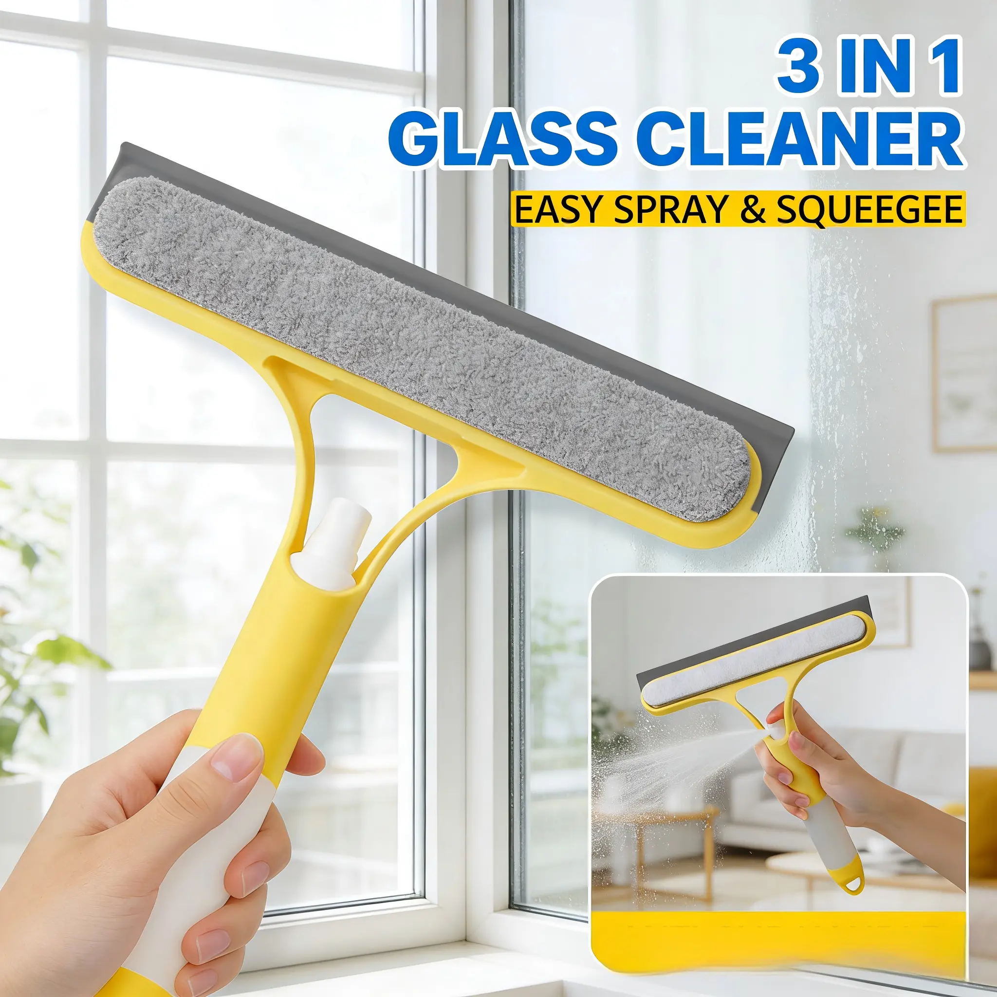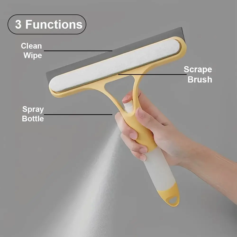 3-in-1 Glass Cleaner Scraper + squeegee + scrubber + spray in one design, easy to deal with home windows, mirrors and car windscreen cleaning! Efficient cleaning, one scrape and you're clean! brush tool cleaning tool