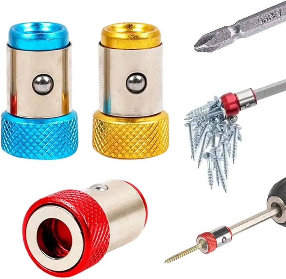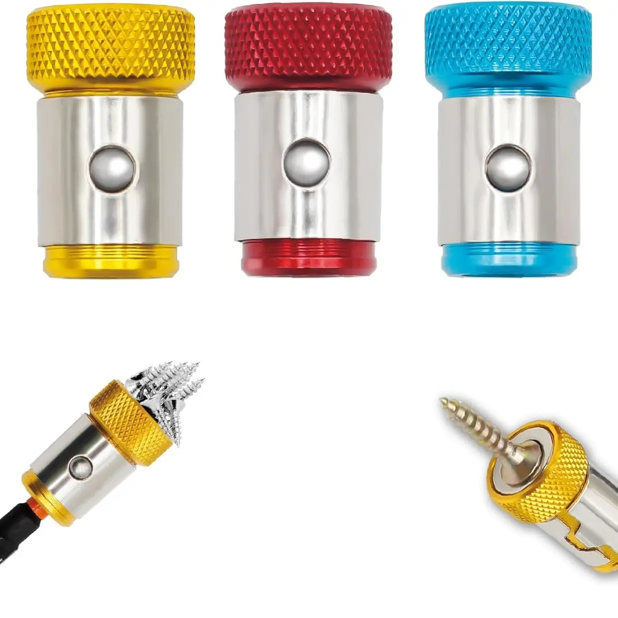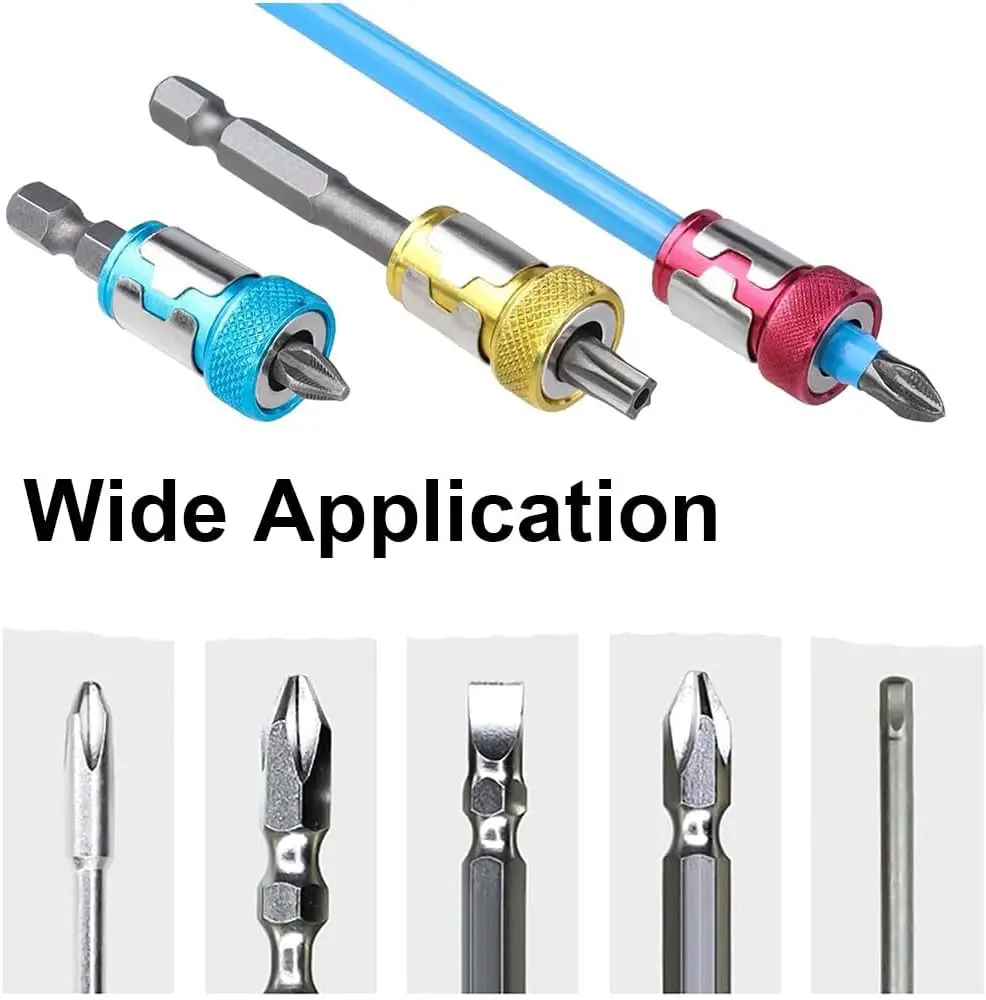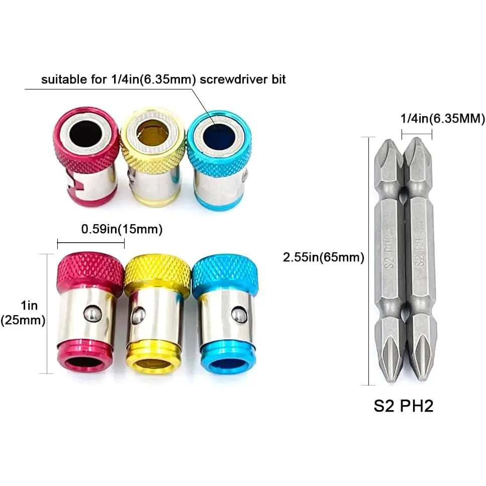 This set includes 6 magnetic screw rings and 2 Ph2 screwdriver bits. The screw rings come in red, yellow, and blue colors. The double-ended Ph2 bits are made of S2 Alloy Steel. These rings are compatible with 1/4 inch shank screwdrivers and various bit types. Perfect for efficient screwdriver operations.
