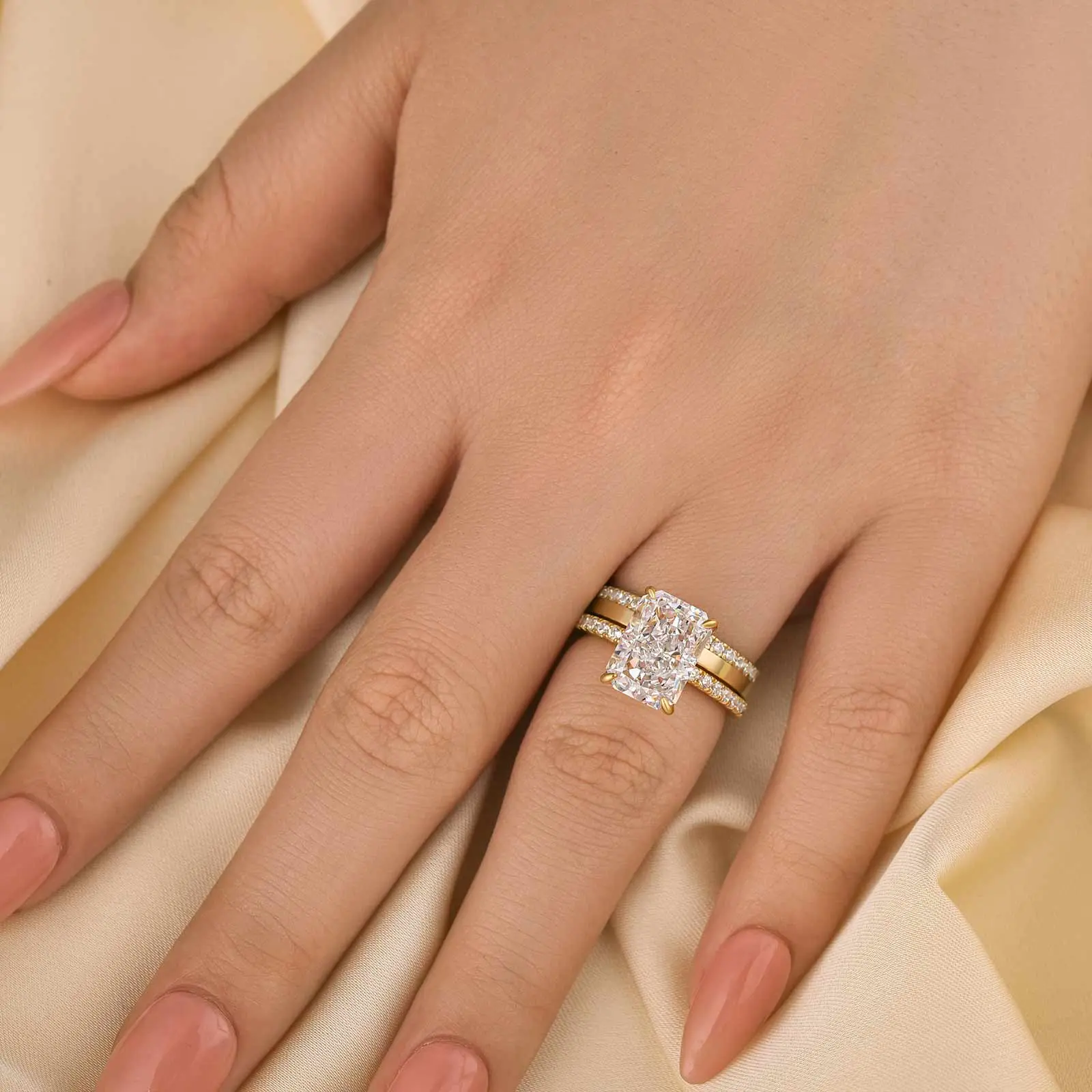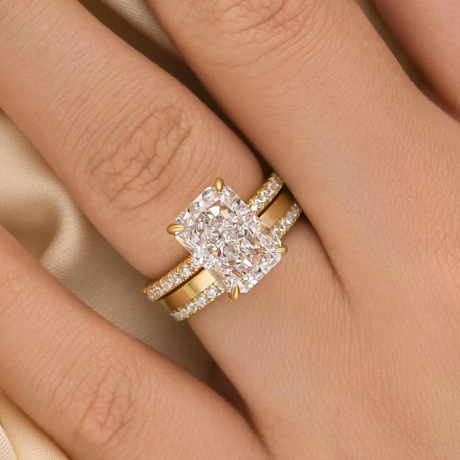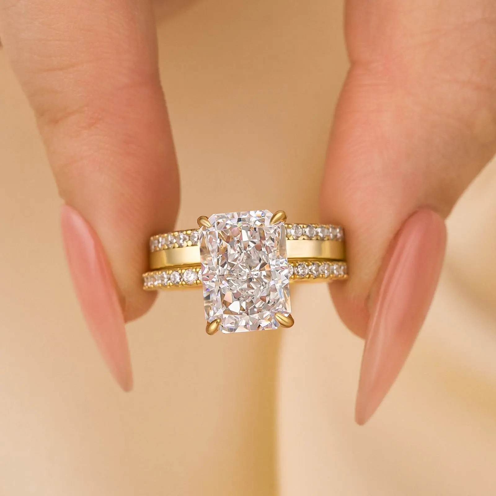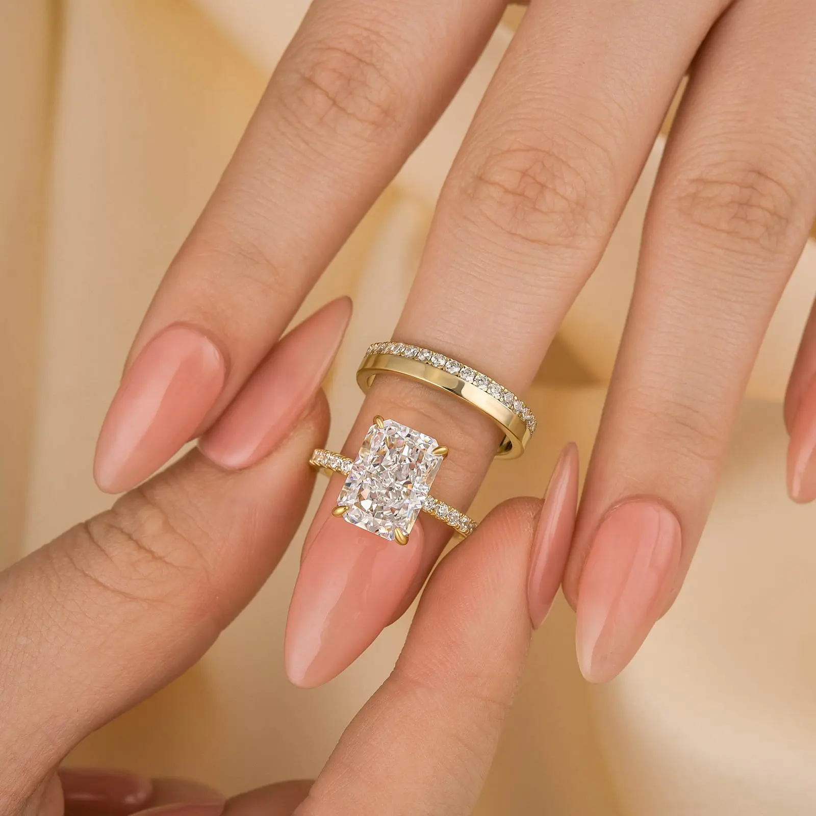 A dazzling 4.5Ct(8*11mm) radiant cut engagement ring paired with a bold wide wedding band — the perfect combination of elegance and strength, designed to shine from every angle.