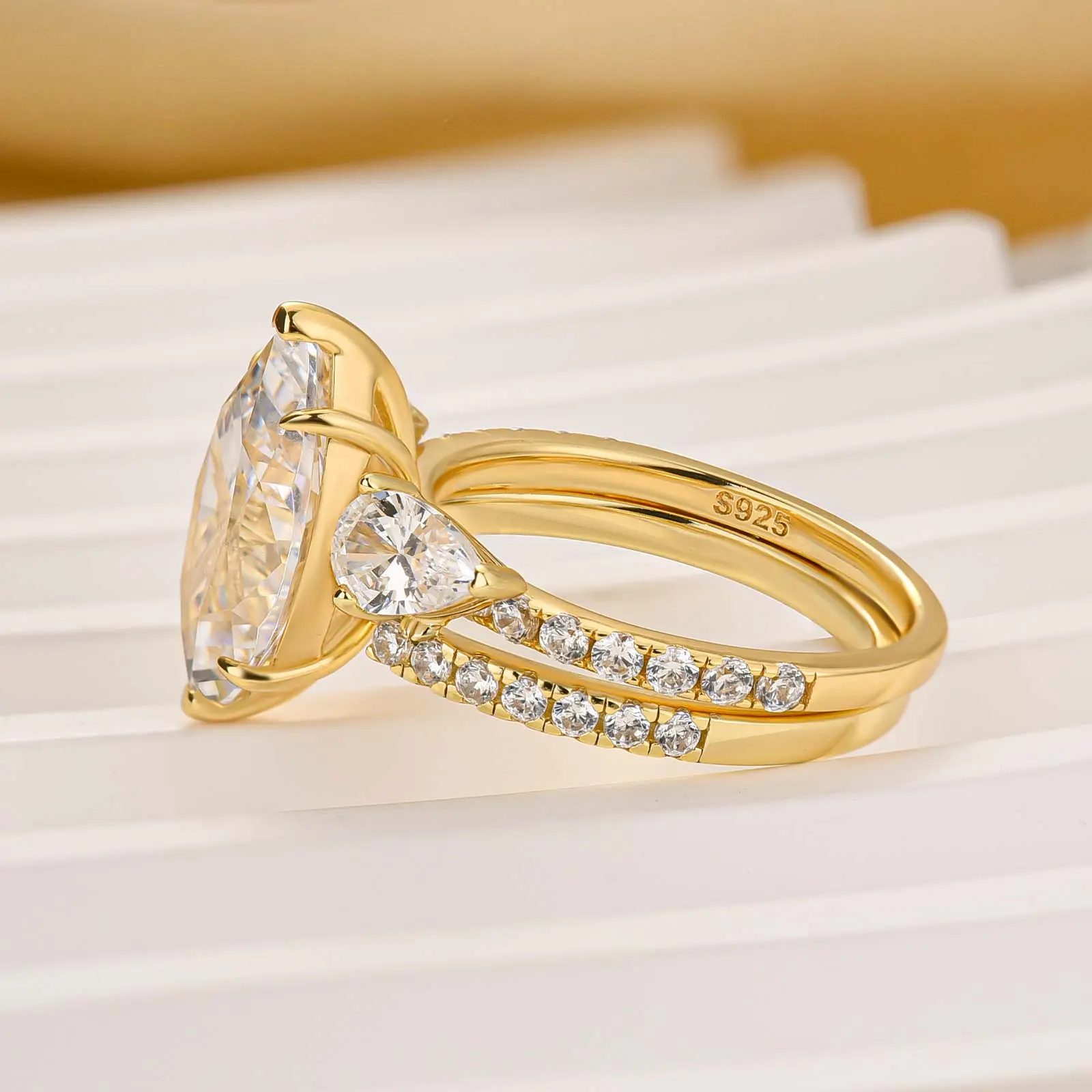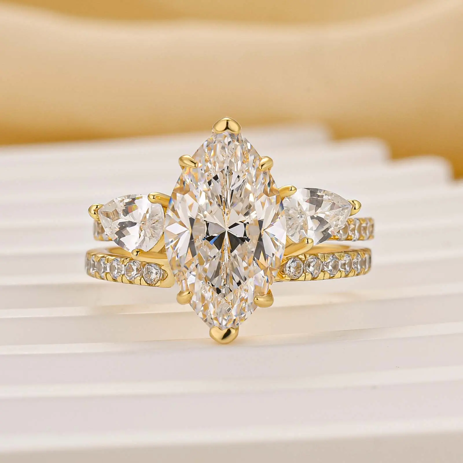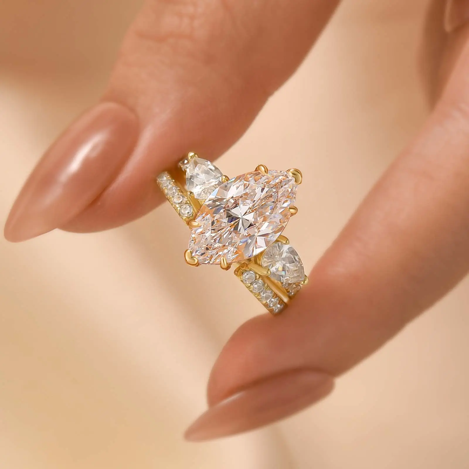 Make a statement with the Effinny Jewelry 4.0ct Marquise Cut 2PC Golden Wedding Ring Set. Crafted from S925 sterling silver with a radiant gold-plated, this elegant bridal ring set features a bold marquise cut center stone and dazzling 5A grade cubic zirconia for maximum sparkle on the go.