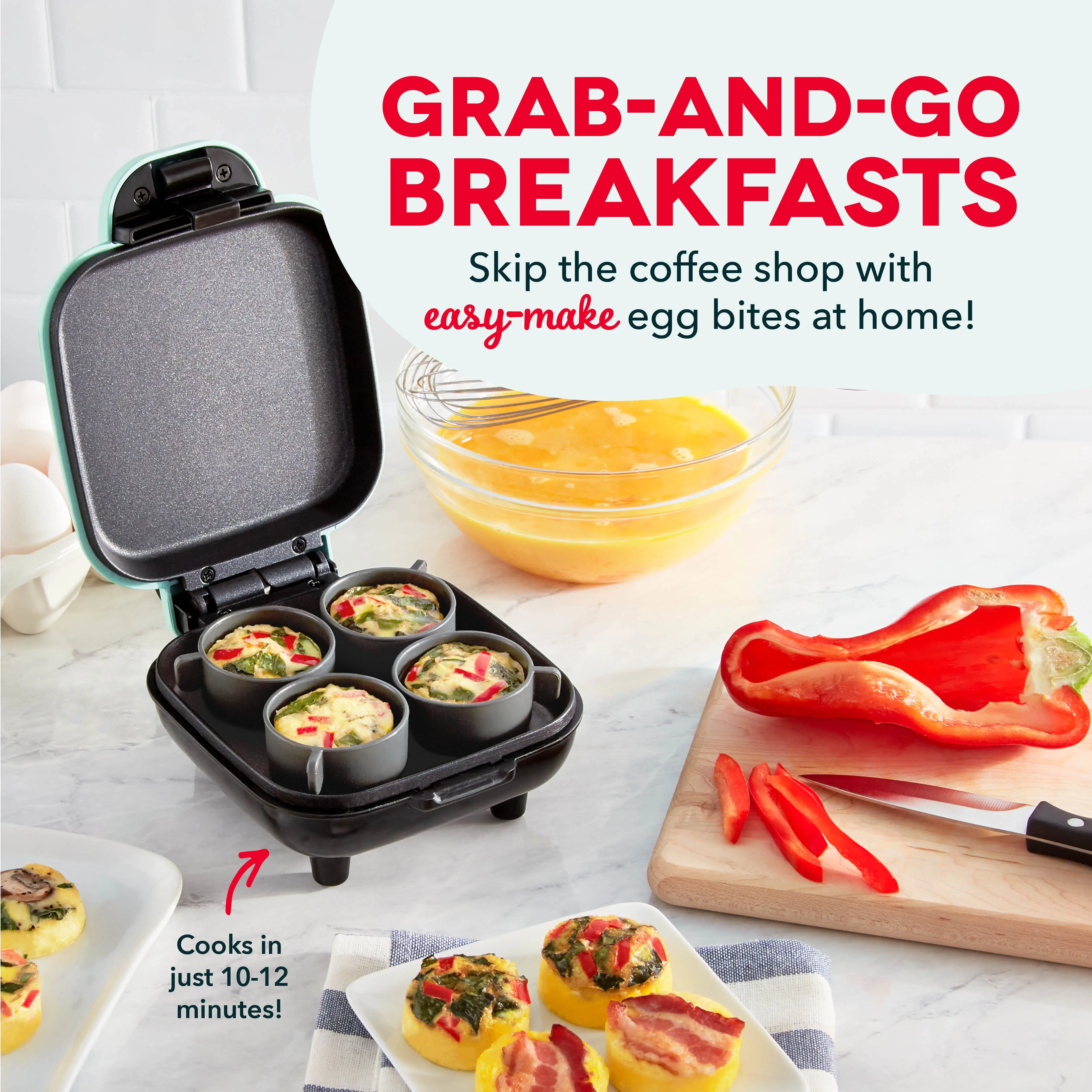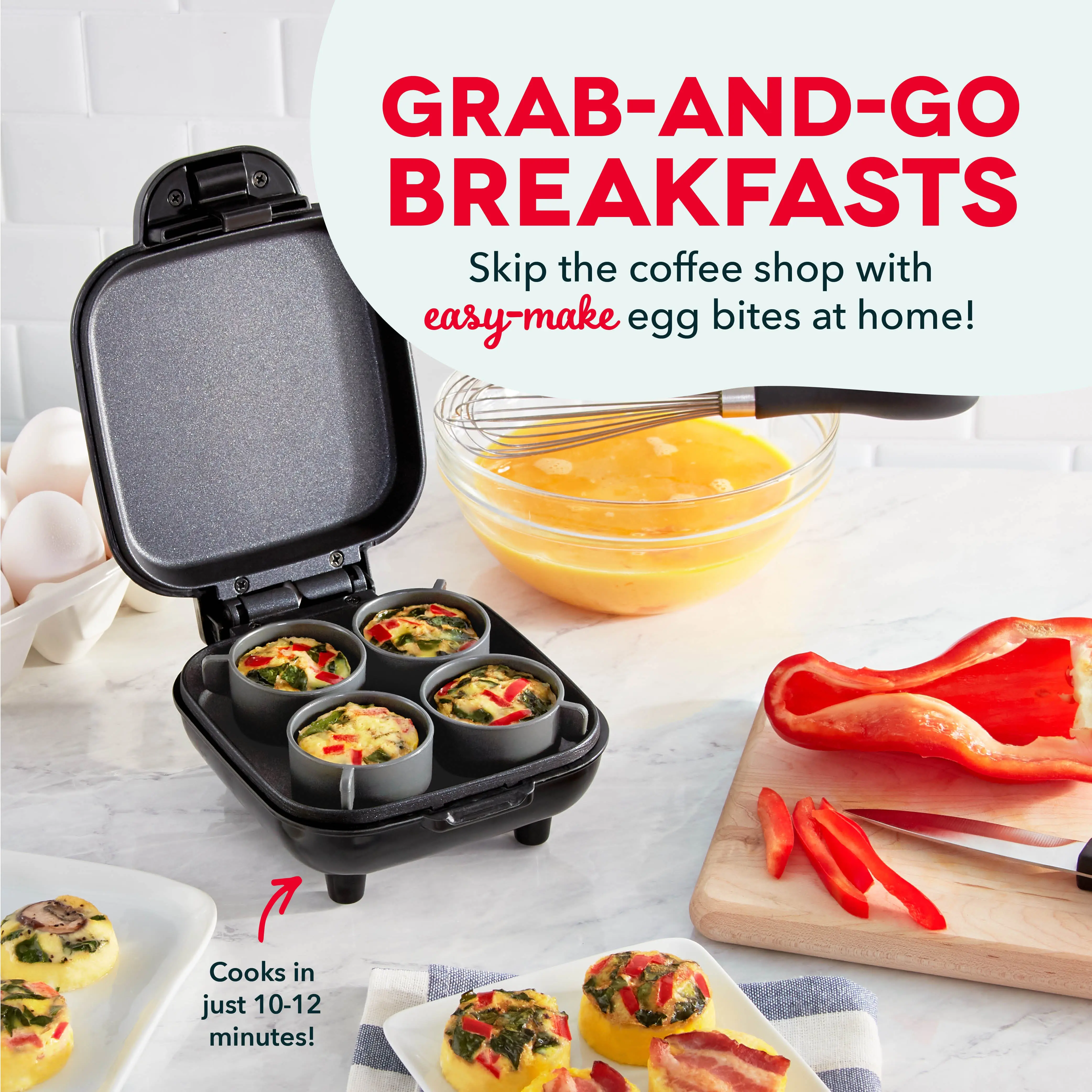 Perfect protein, one bite at a time. Make delicious, healthier egg bites at home with the Dash Egg Bite Maker. Choose your own ingredients for up to 4 egg bites as once, pour into easy-release Silicone Cups, then start cooking with one touch.