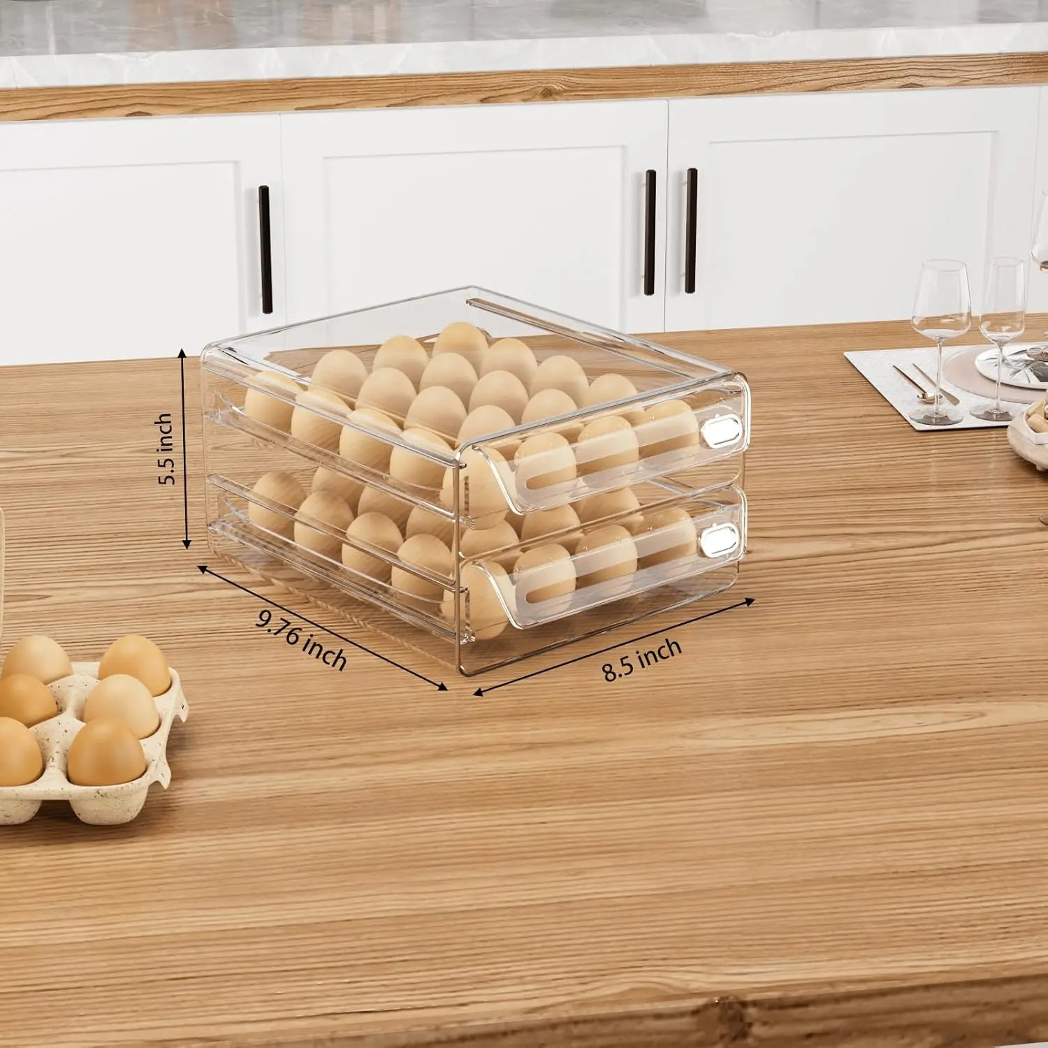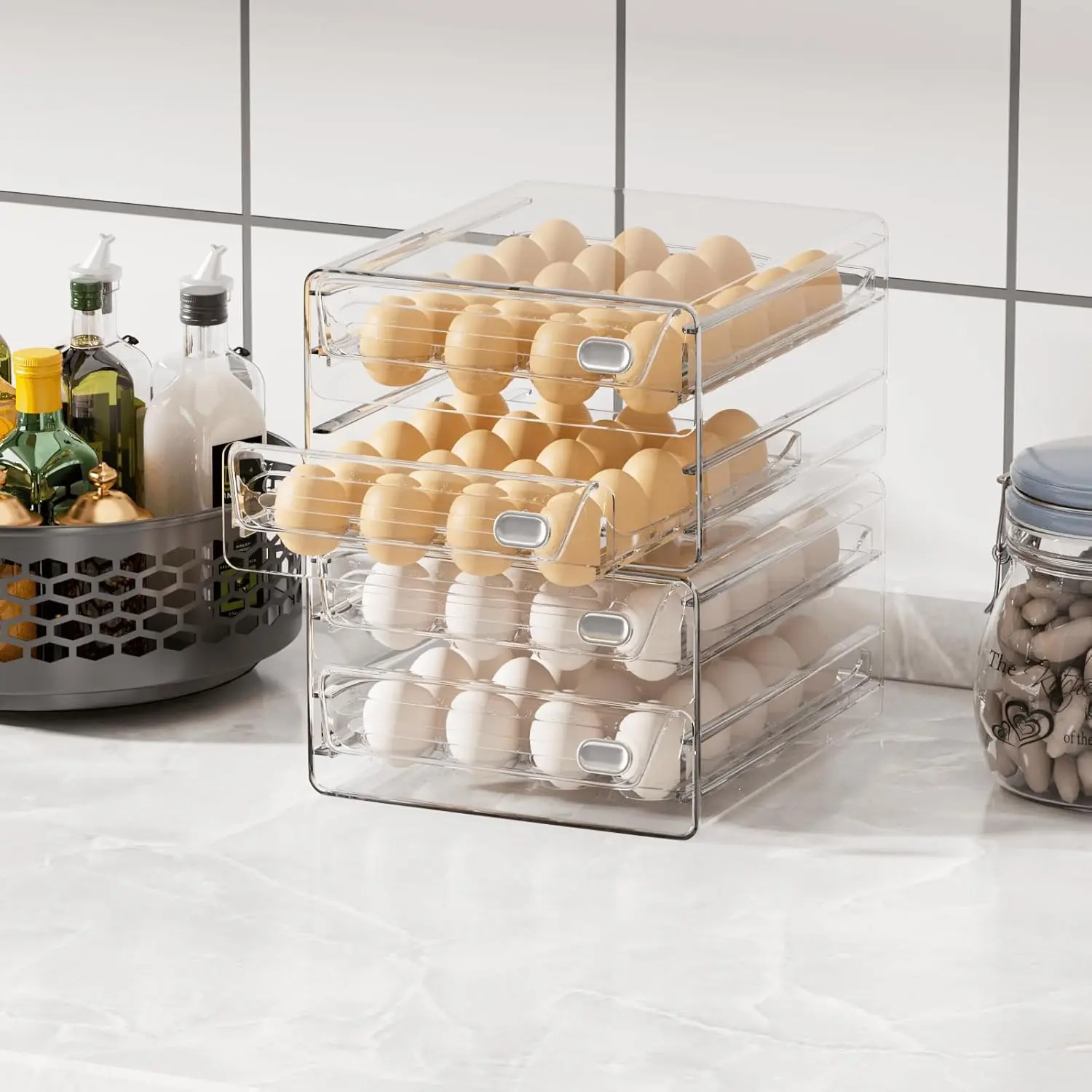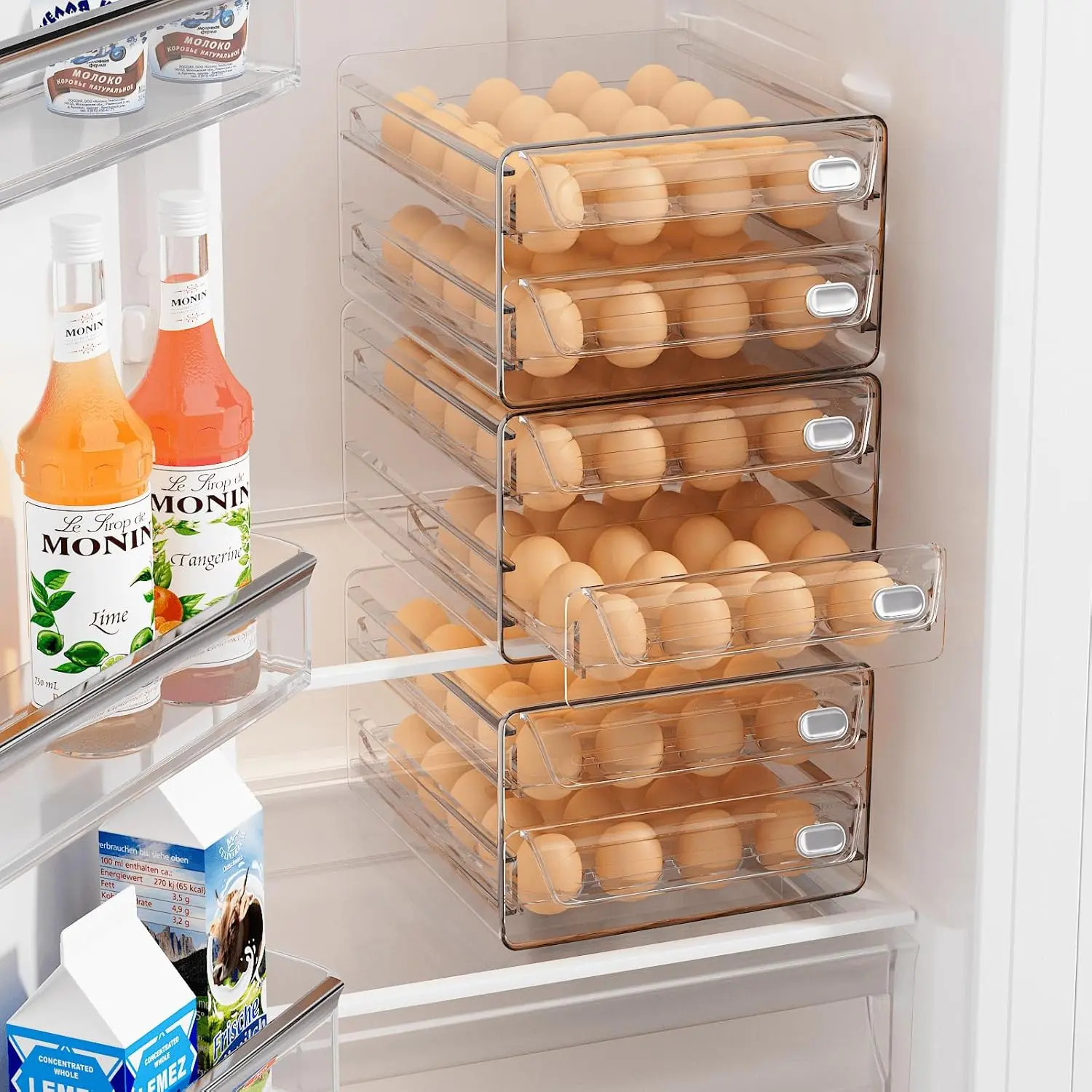 Clear & Transparent Egg Container This egg container for refrigerator, featuring a convenient handle design, offers effortless egg access.The pull-out egg drawer can be fully extended, simplifying cleaning and maintenance for added convenience.Upgrade your egg storage with ease.