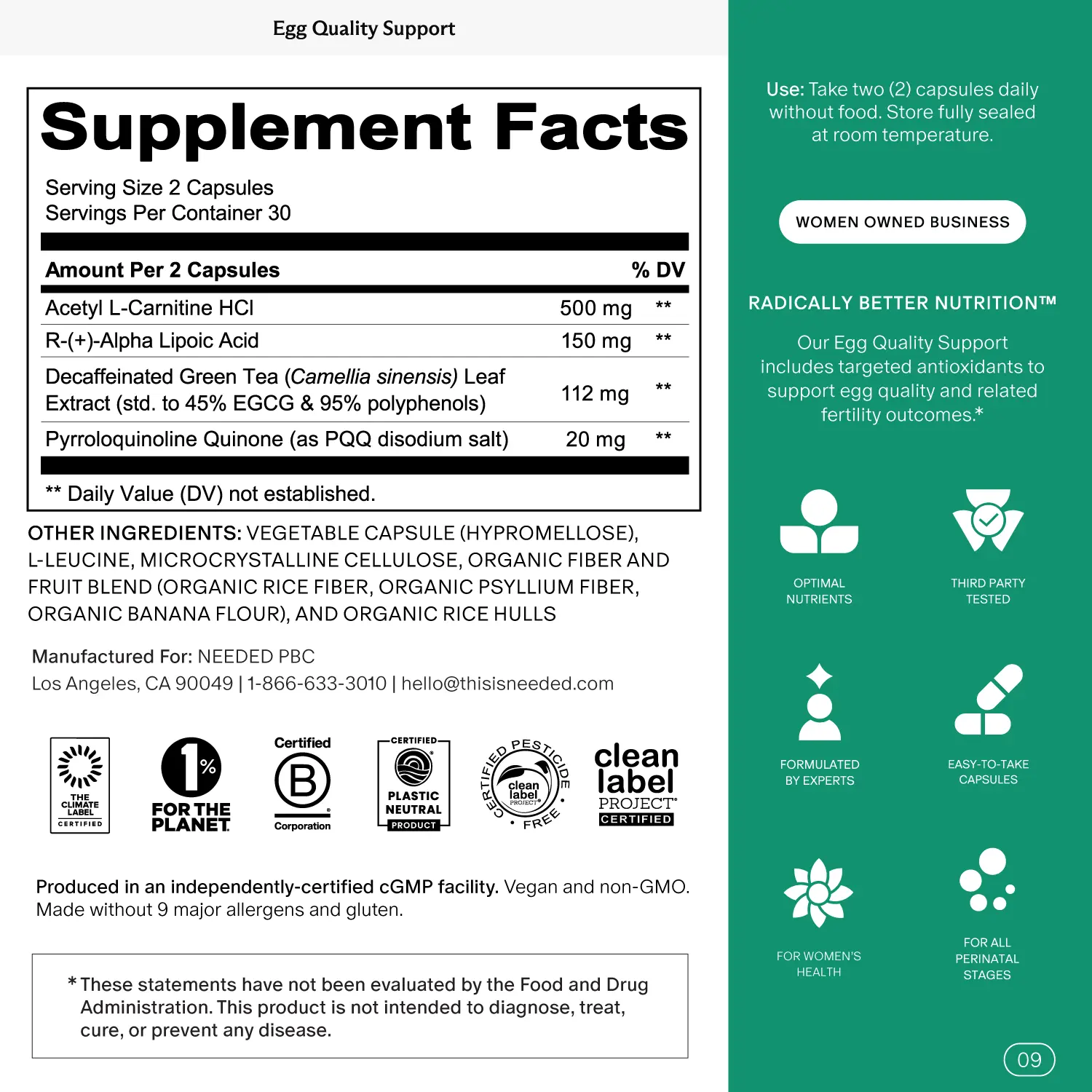 ·Our Egg Quality Support is formulated by perinatal health practitioners to help you (and your eggs) thrive. You are born with all of your egg cells (oocytes), and an oocyte takes 3 to 4 months to mature before ovulation. Our Egg Quality Support is designed to support egg cell health as they develop into mature eggs. Improving egg quality can support fertility outcomes.