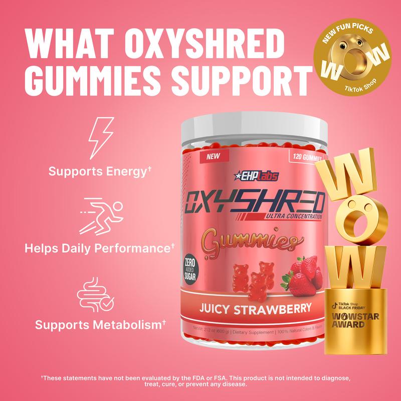 ✨ Experience the OxyShred Gummies! Each pack of 120 offers a convenient, tasty energy boost. These vegan-friendly gummies contain L-Carnitine, natural caffeine, green coffee bean extract, inulin fiber, and chromium picolinate. No added sugar or artificial colors. Perfect for busy individuals seeking a portable energy source. 🍓