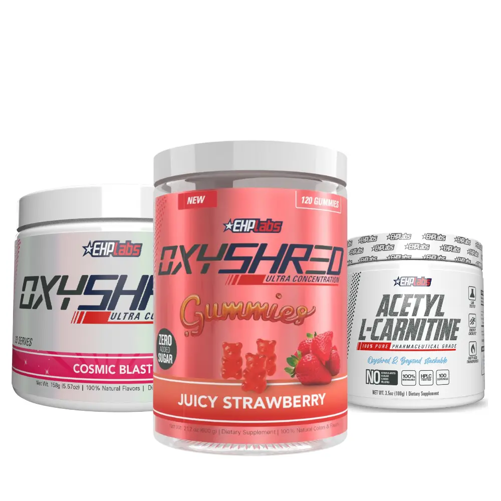 EHPlabs OxyShred Pre Workout, OxyShred Gummies and Acetyl L-Carnitine Stack | Complete Energy and Metabolism Support Stack | Pre Workout Powder, Functional Gummies and Unflavoured Carnitine for Daily Performance