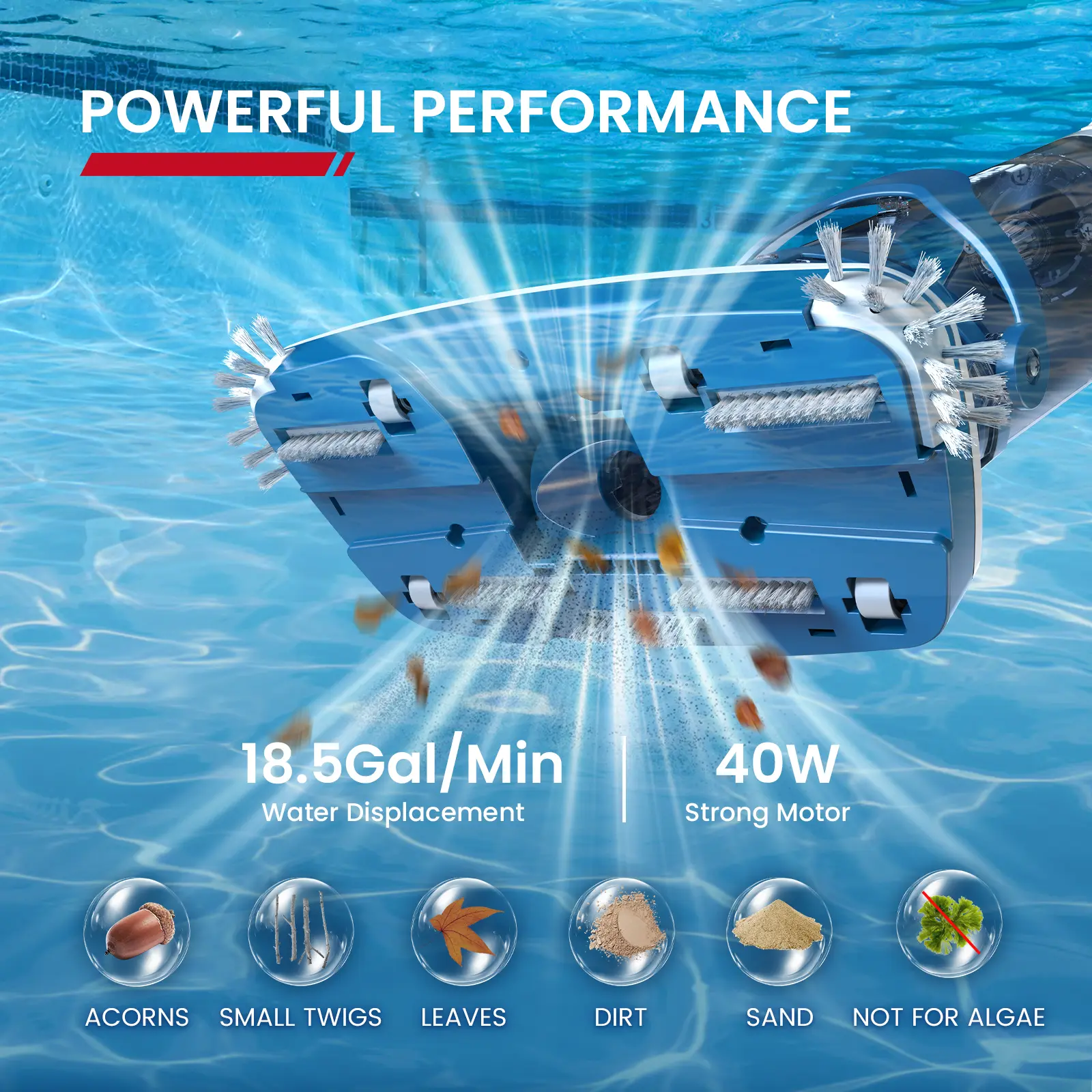 ·Powerful Suction: Strong motor with a max flow rate of 18.5 gallons/min for quick debris pickup (not for algae).