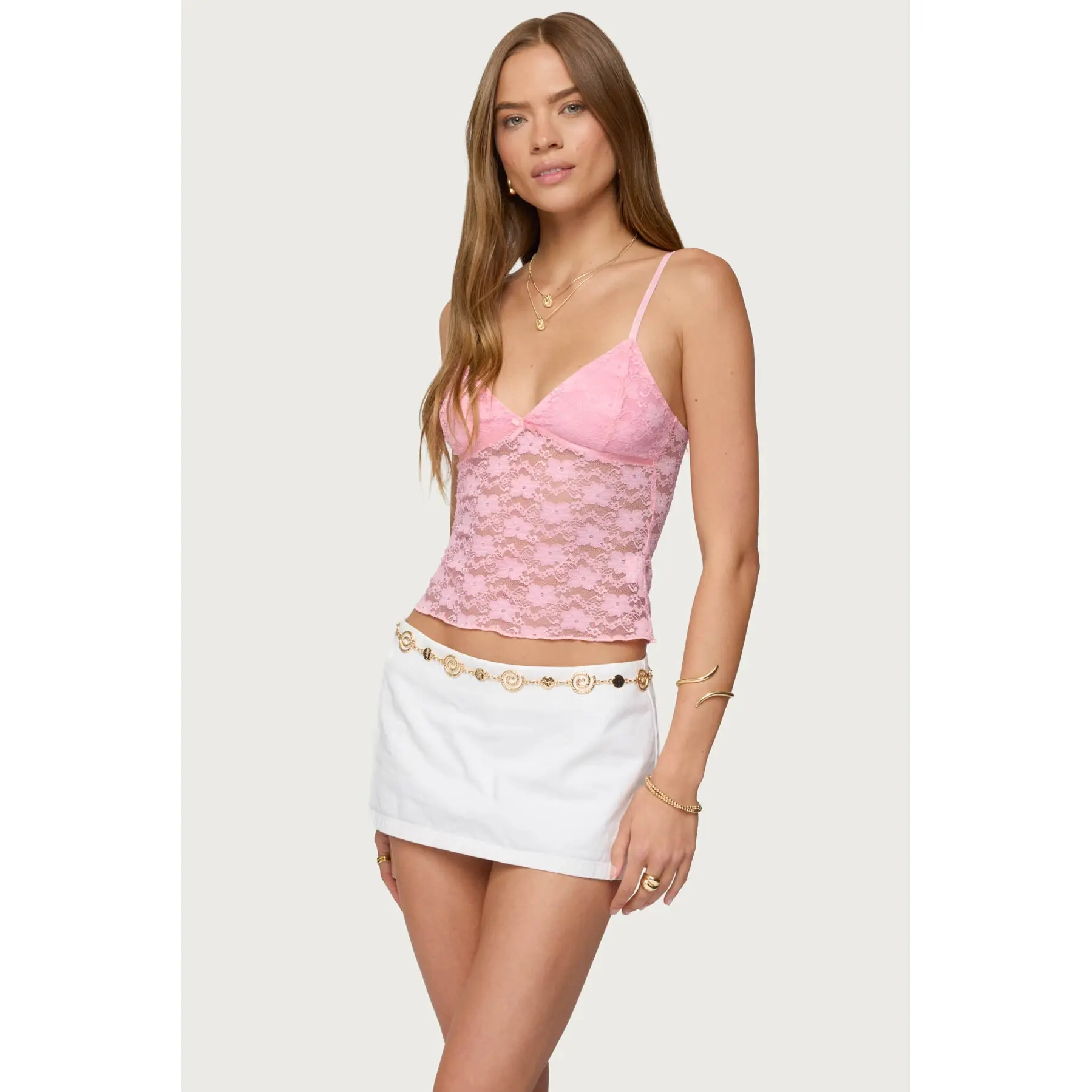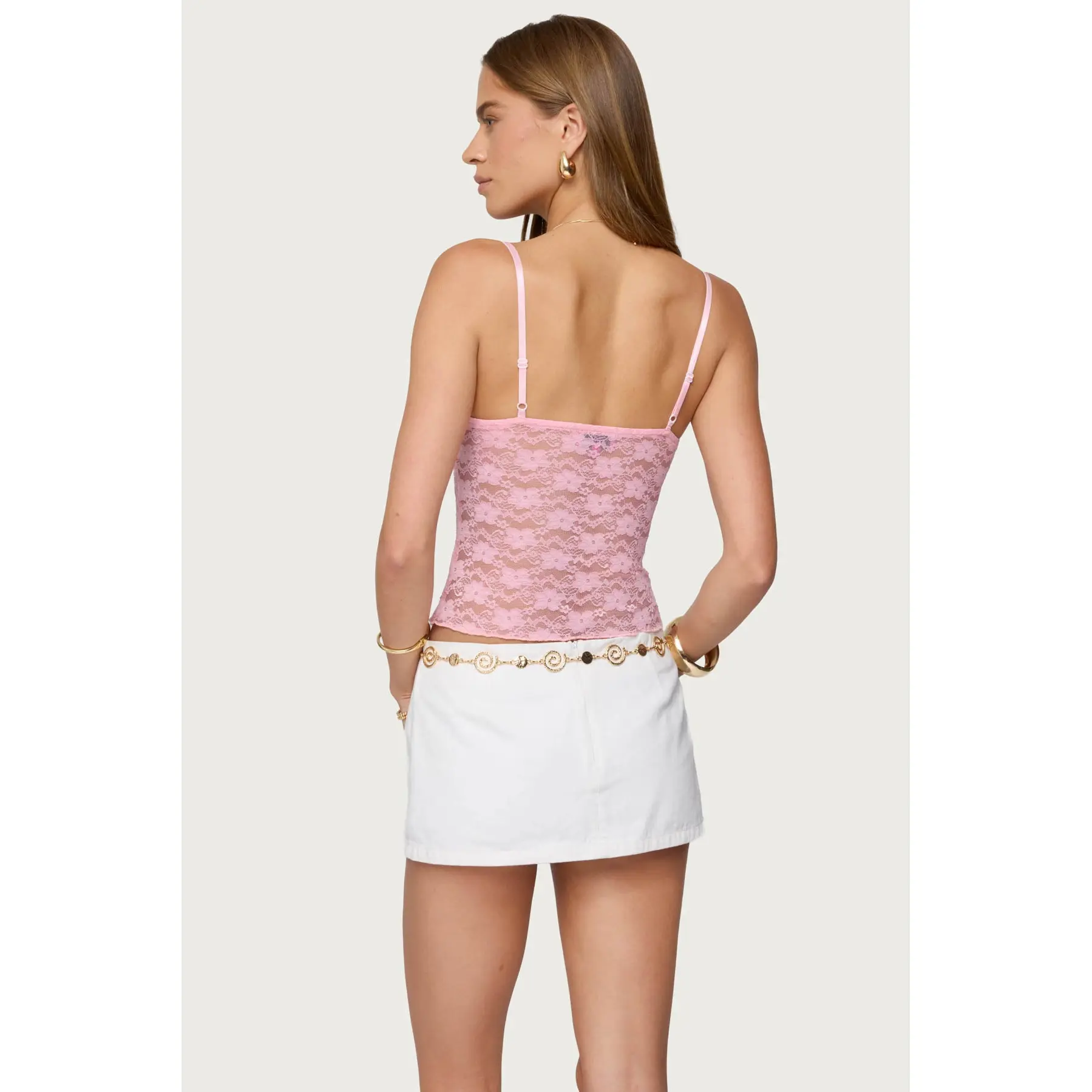 Love new Edikted sheer lace tank top in pink! Pair nicely with chiffon skirt and striped pants #sheertop #lacetop #goingouttop #pink #edikted