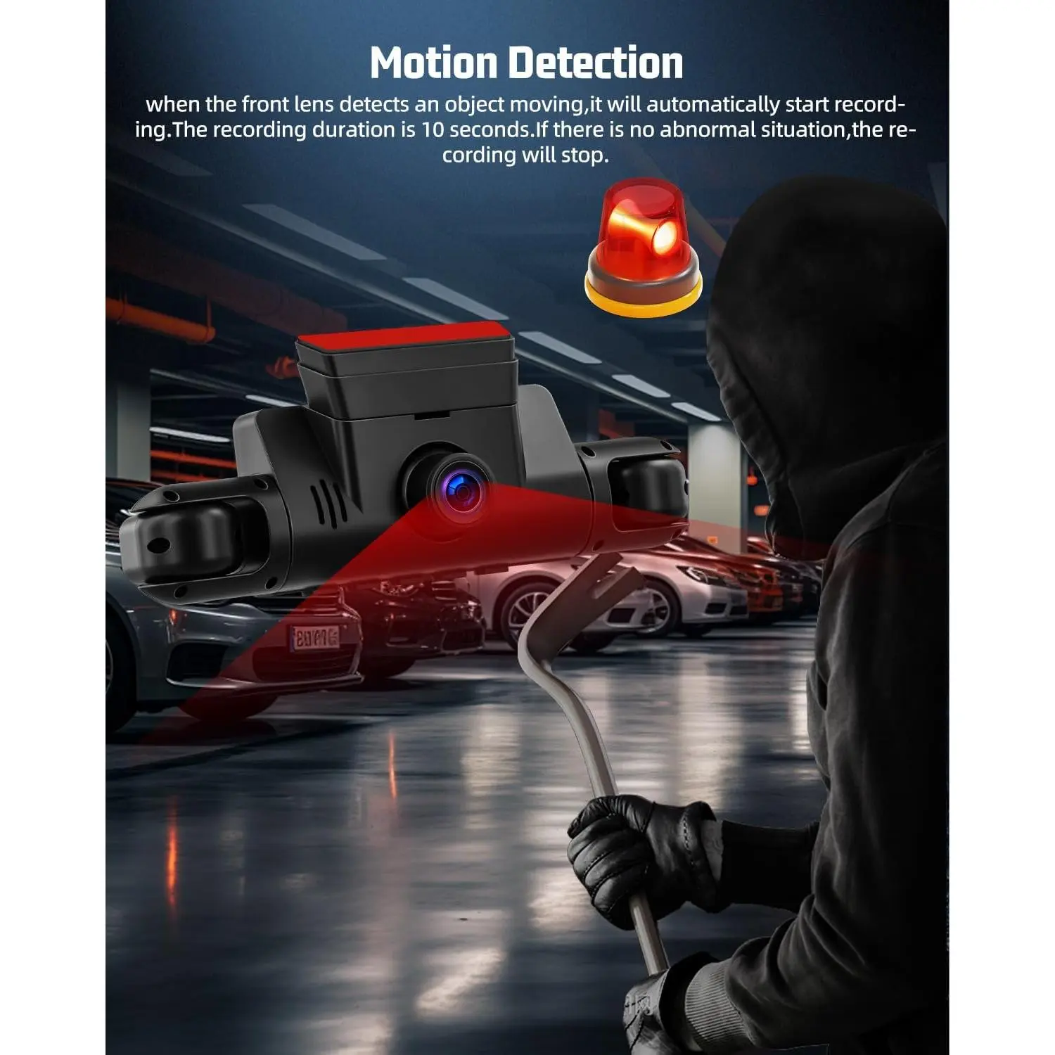 5) Motion Detection. Motion Detection-When the recorder detects a moving object near the vehicle, the recorder will automatically enter the recording state and record the moving object; when the recorder does not detect any moving object, the machine will stop recording.
