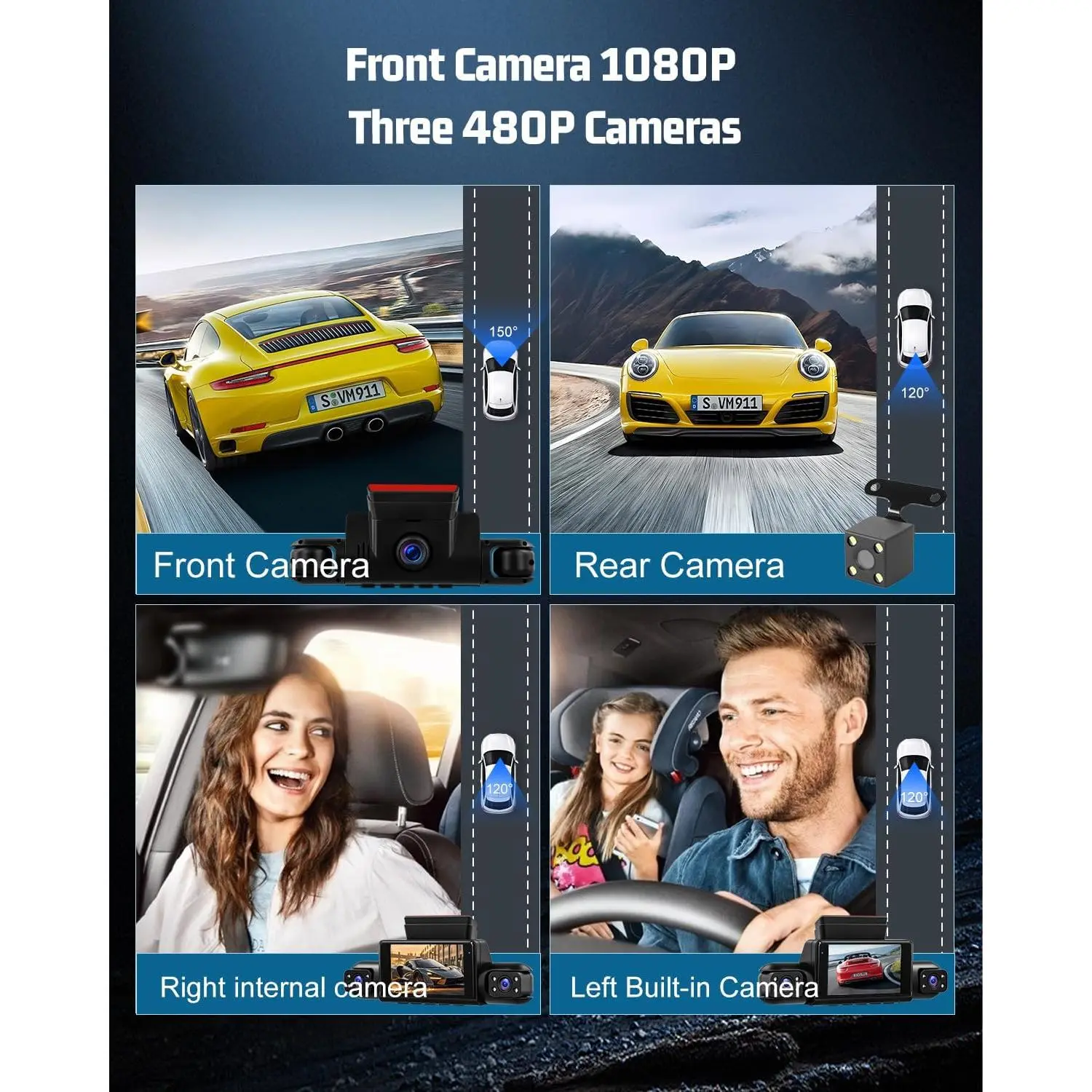 6) Special features: 1080P, four cameras, loop recording, exposure compensation, motion detection, night vision function, reverse help, 360 degree protection