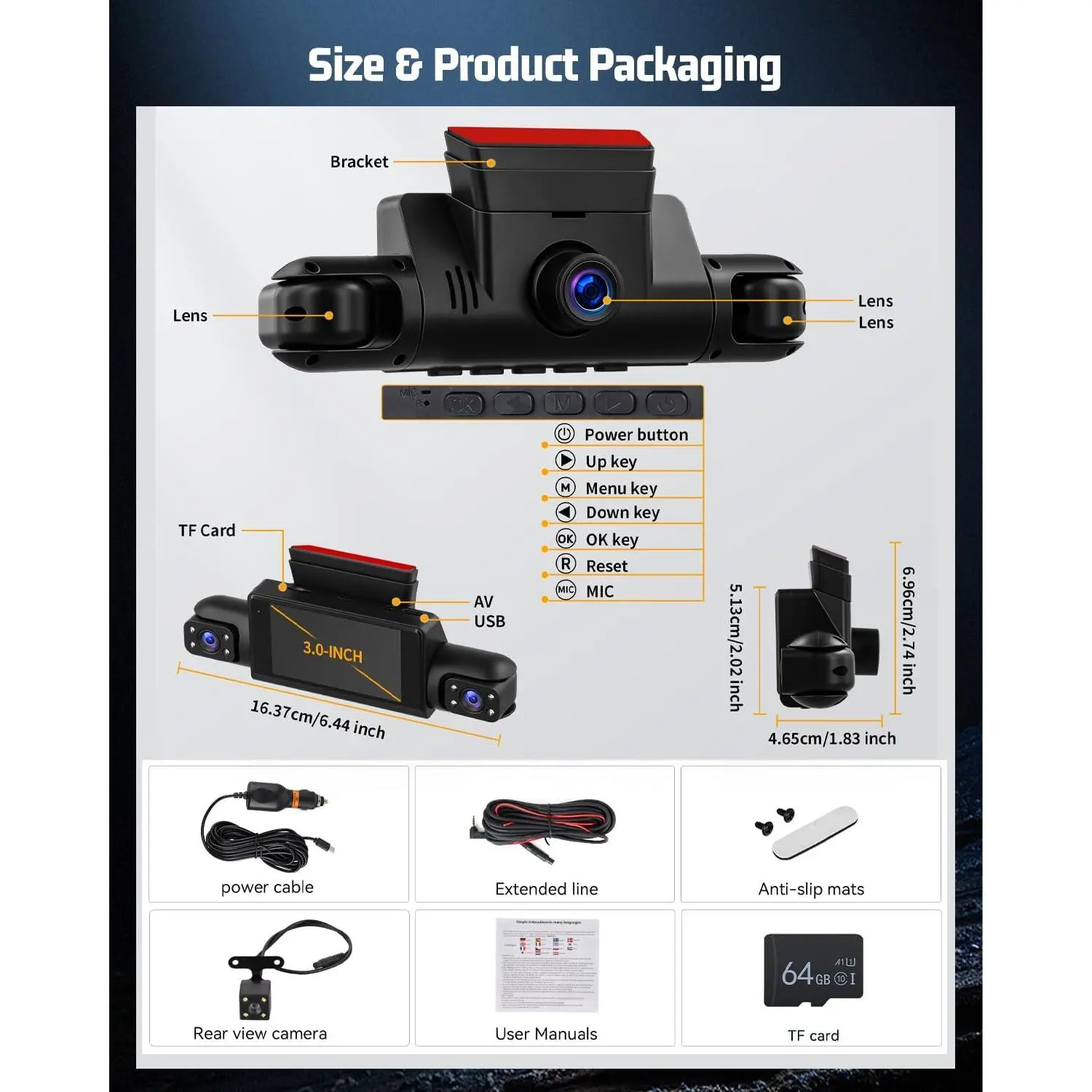 2) Four Cameras. Equipped with four cameras, the built-in two lenses can adjust the shooting angle, allowing you to capture more details as you like. The shooting range can easily cover 360 angles, ensuring that there is no dead angle around the car.