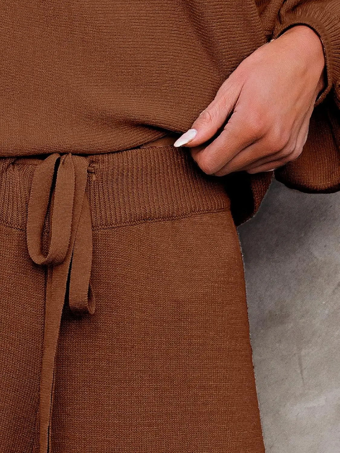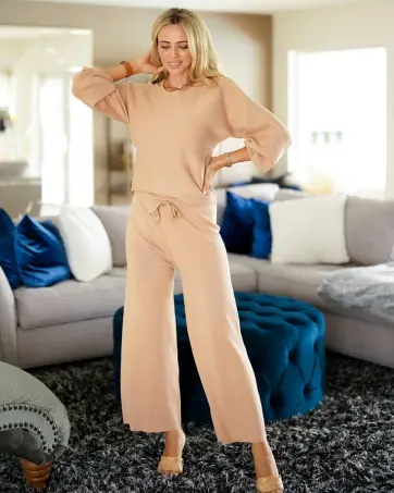 ·100% Polyester,2 Piece Knit Set - Wide Crew Neck Tops + Long Wide Pants. Pair this off shoulder top with the Cozy Knit Wide Pants for the ultimate loungewear set. Make you feel comfy all day long.