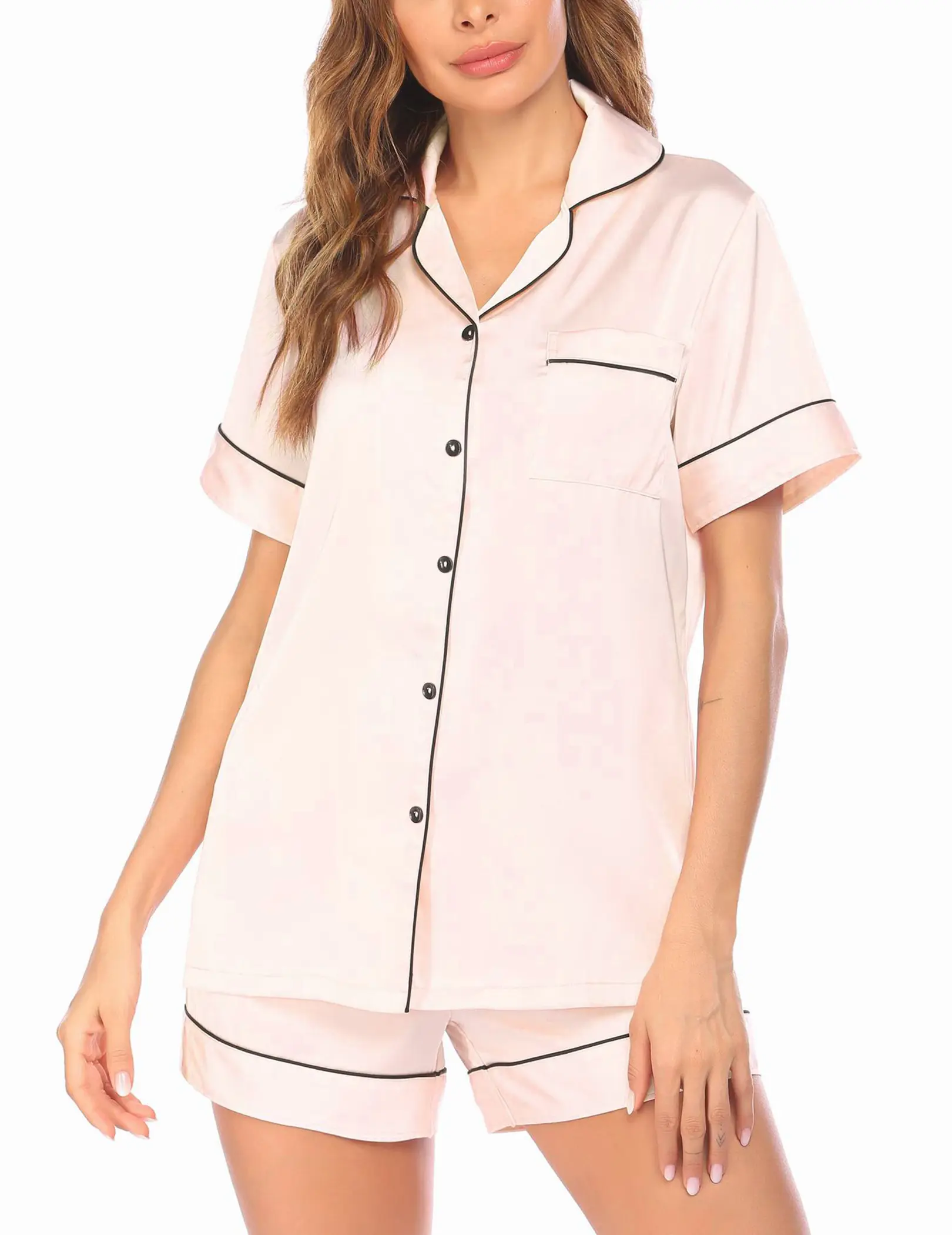 Pajama Top:Short sleeve sleepwear with notch collar,button front pajamas shirt and one chest pocket design.Lightweight and Skin-friendly silk pajamas for women.Great for sleeping,casual wear or lounging around the house or yard all day