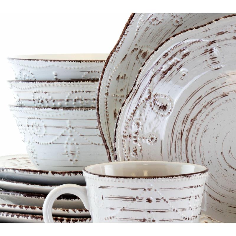 5. Elama Rustic Birch 16 Piece Stoneware Round Dinnerware Set