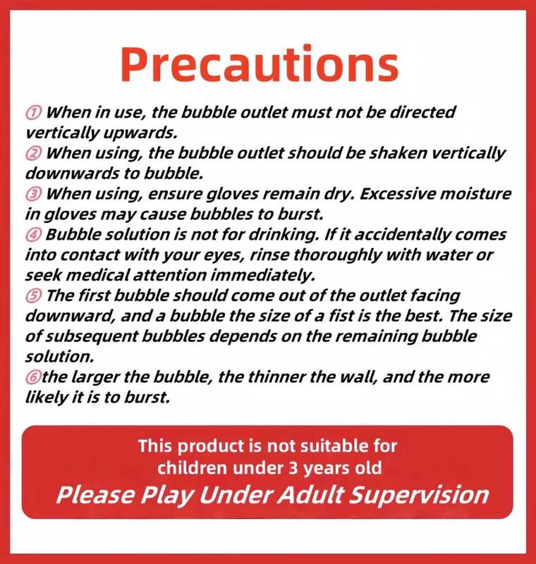 ·Includes Gloves & Spill-Proof Cup: The package includes gloves and a spill-proof cup, ensuring safe and hassle-free bubble play. The safe bubble solution is included, making it suitable for kids. 🌿