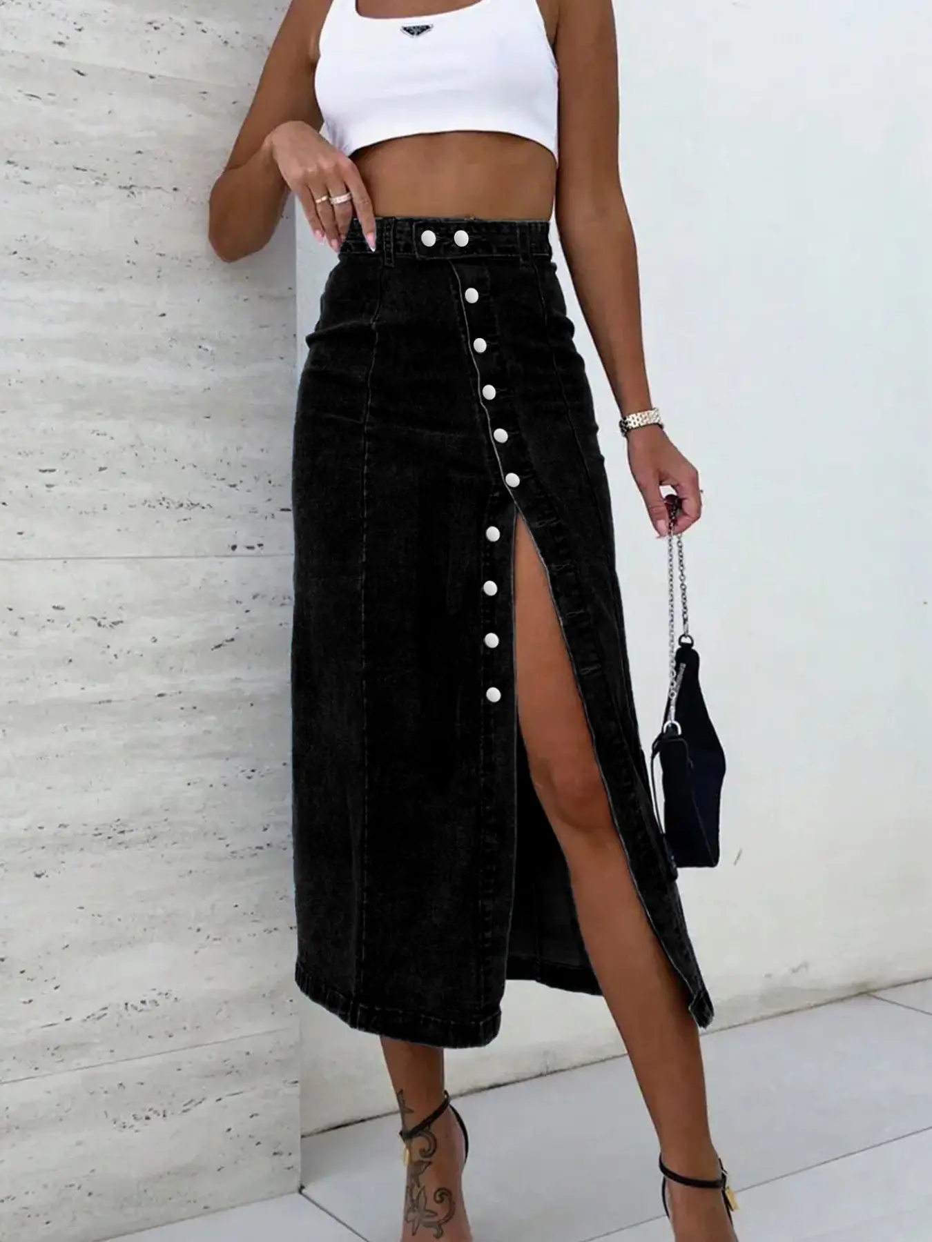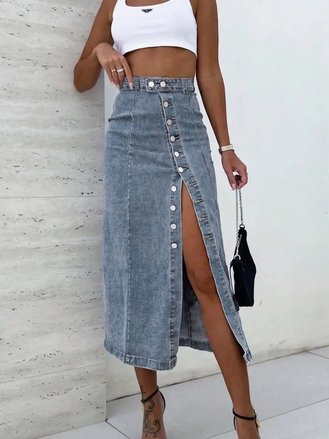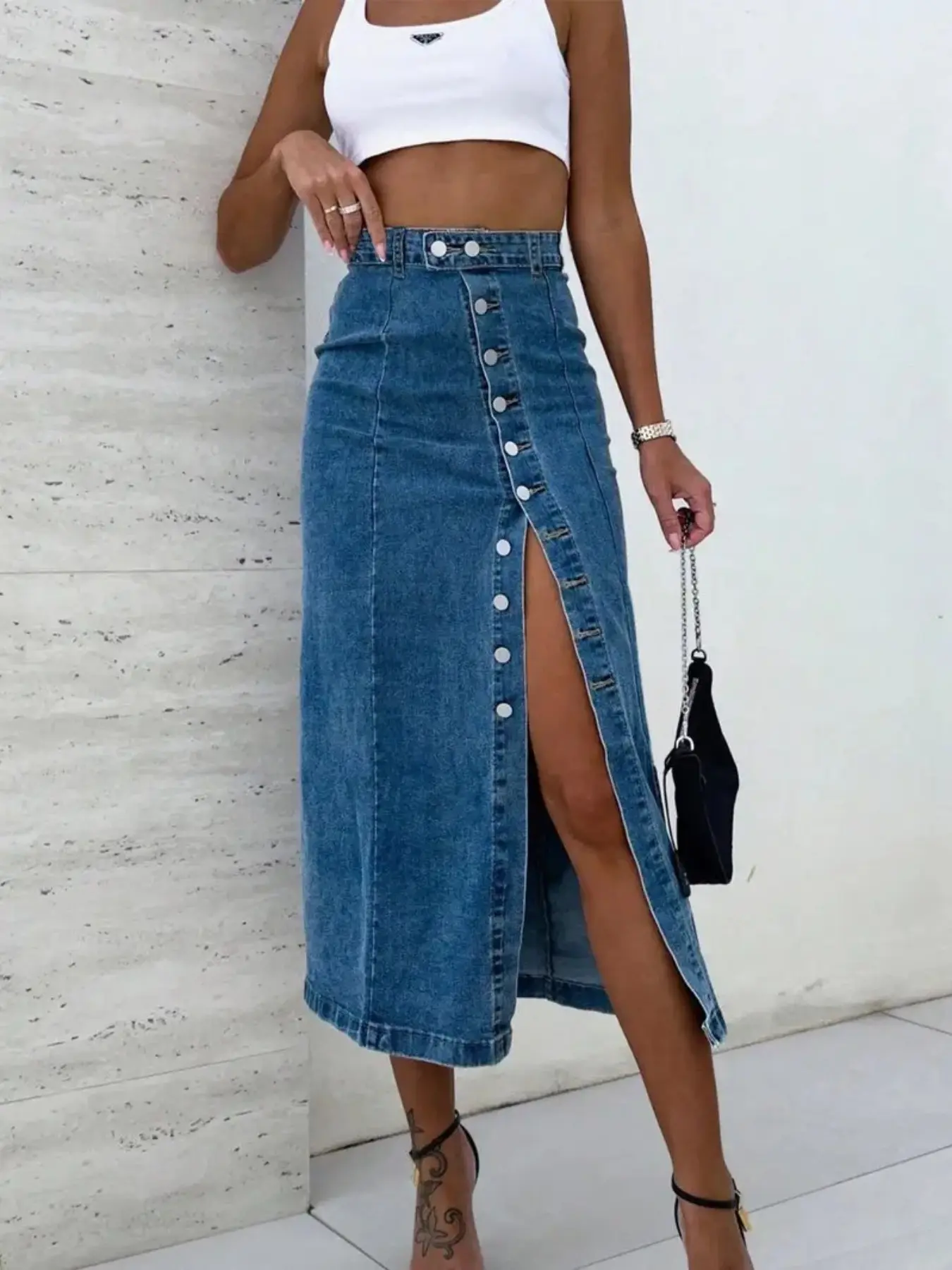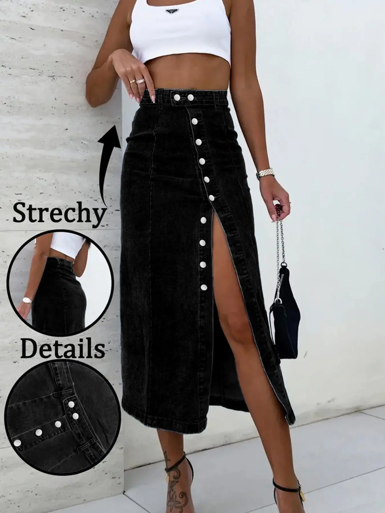 Elastic Washed Casual Button Fly Denim MIDI Skirt for Women #tiktokshopblackfriday #tiktokshopcybermonday #women #ootd #fyp