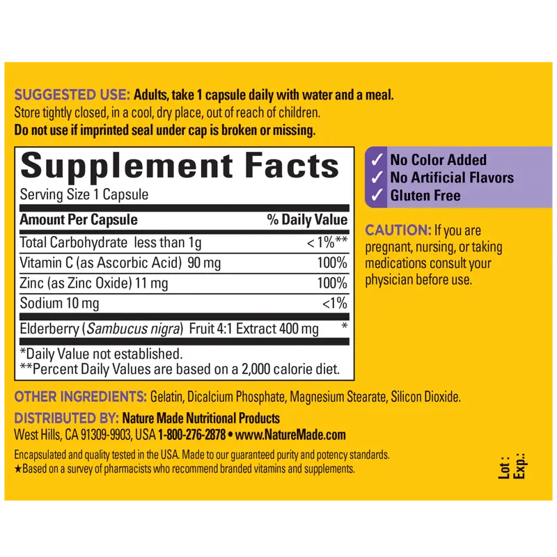 Aiming for antioxidant support? This black Elderberry supplement provides 100% of the Daily Value for Vitamin C and Zinc, two key immune support nutrients—in just one daily capsule. †