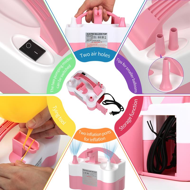 The PULIDIKI balloon pump kit includes 1 electric pump and 2 tying tools. It's fashionable in pink and white. These accessories are perfect for creating balloon decorations. The kit measures 8.1 x 5.5 x 6.5 inches and operates on 110-120V, 50Hz, with a power output of 600W and an air volume of 800 (L/min). It's a compact, portable solution for your party needs.
