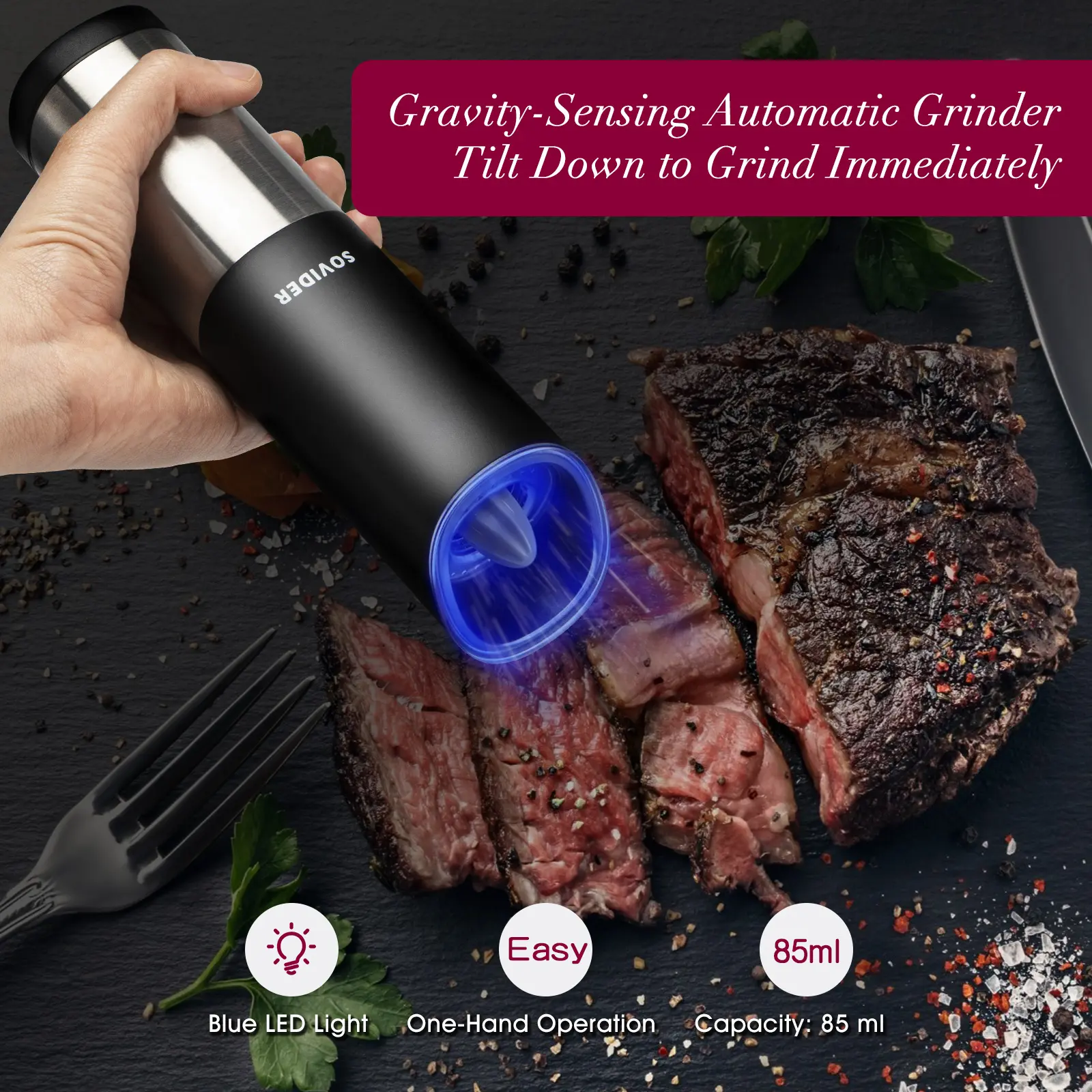 Grind With No Effort: pepper grinder with a built-in gravity sensor helps us grind spices with no effort. It can automatically do the grinding by being tilted down 45 degrees, ultra-easy to use.