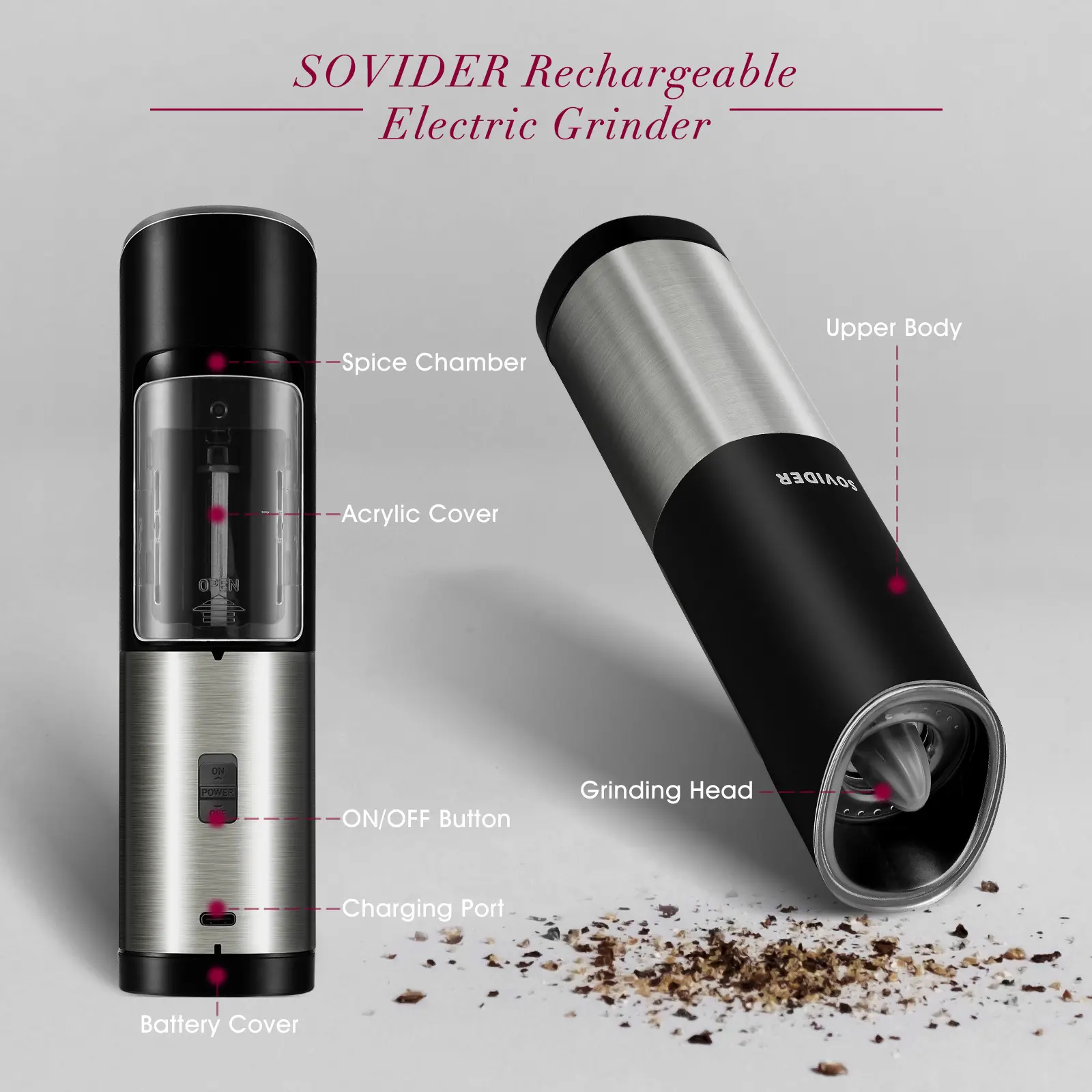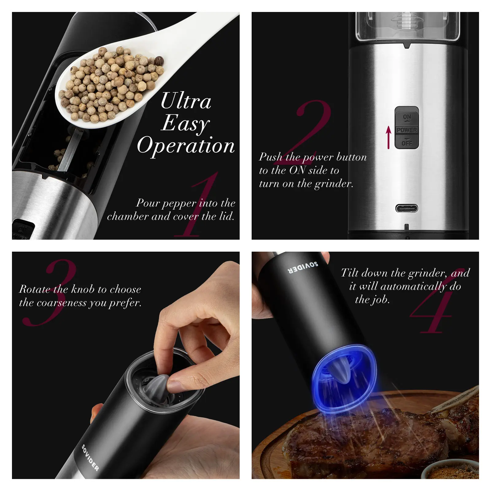 Rechargeable Design: pepper grinder features a rechargeable design besides supporting battery replacement, freeing us from the annoyance of sudden battery low.