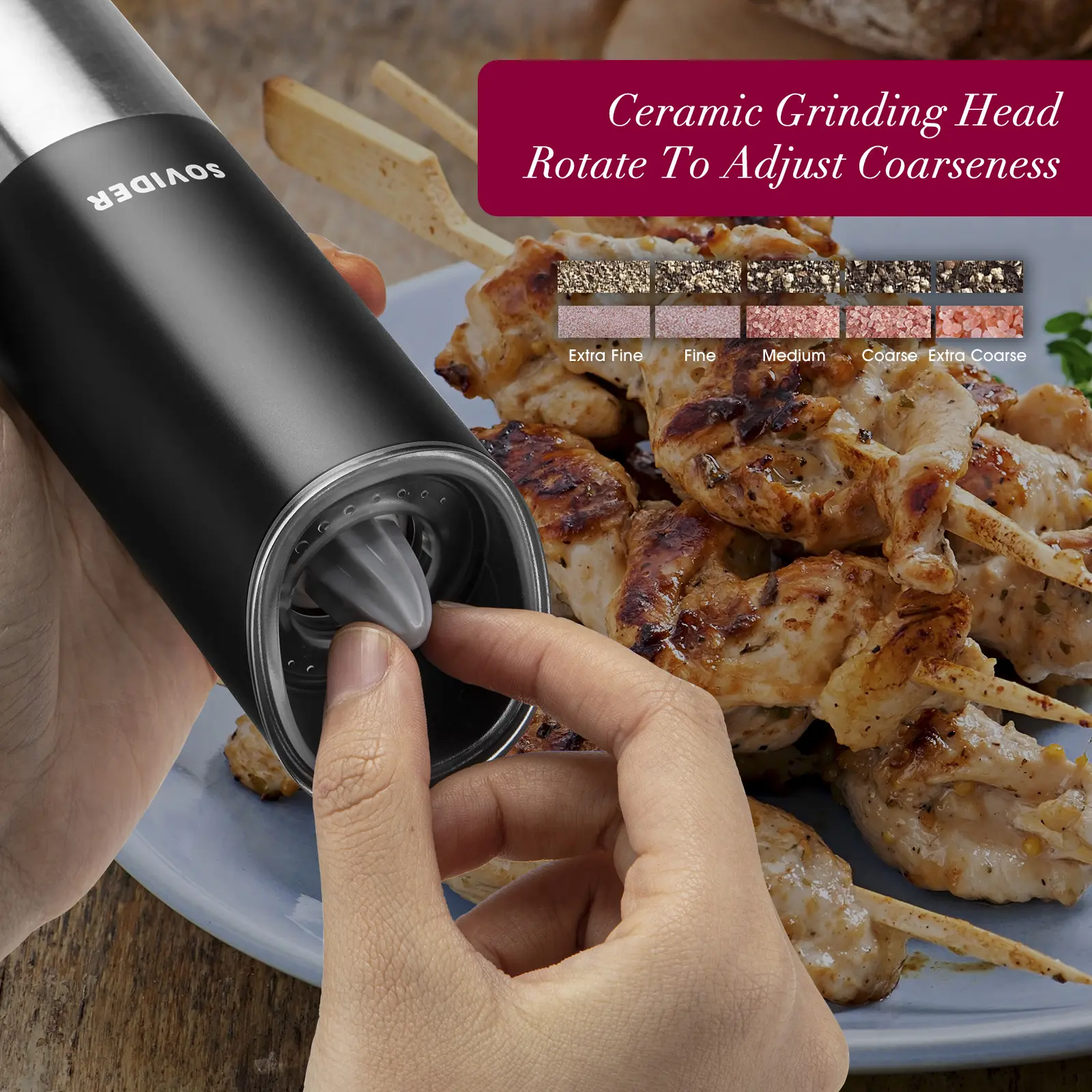 5 Levels of Coarseness: Five levels of coarseness are adjustable, suiting different taste preferences. By simply rotating the ceramic grinding head, we can get uniform spice powder as coarse as we like.
