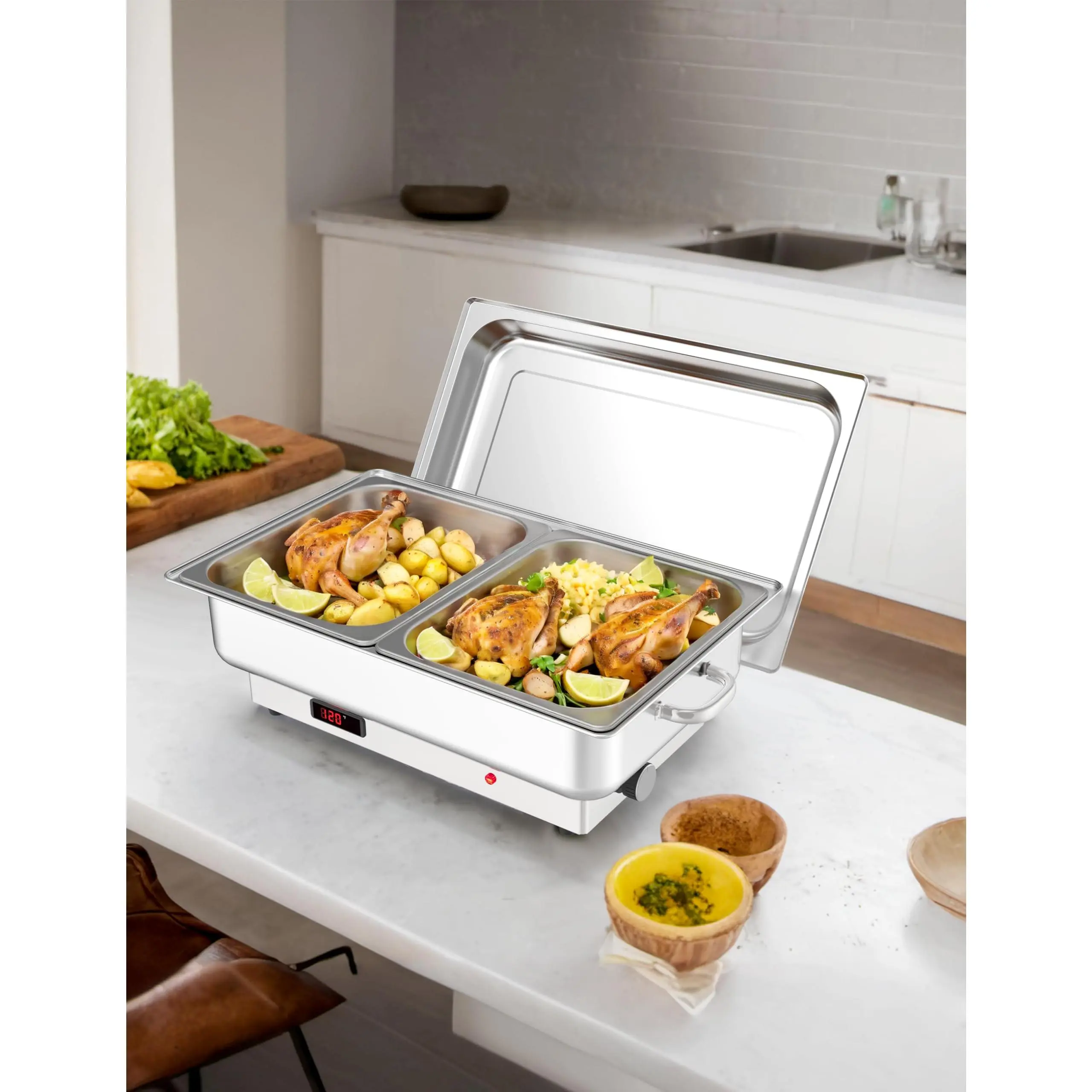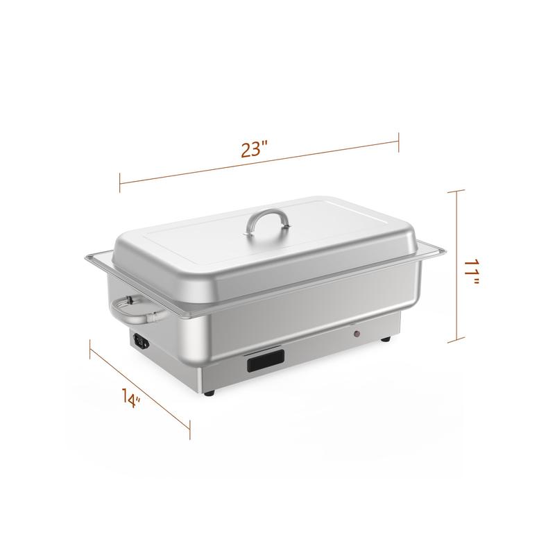 The electric chafing dish buffet set is made of food-grade stainless steel with a 1/1 NSF certification, sturdy and durable for long service life. The electric chafing dish is easy to clean and maintain.