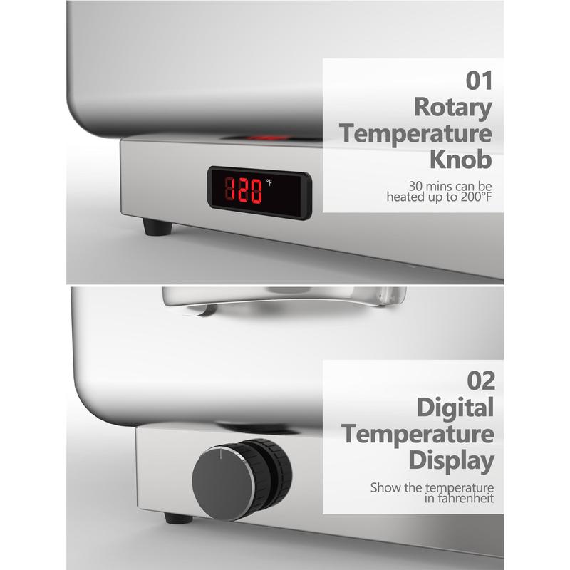 Powered by a 400W built-in heating element, after filling the water pan with water, it can be easily adjusted between 86°F and 200°F (30°C and 93°C) to suit your food service requirements, low power consumption higher efficiency.