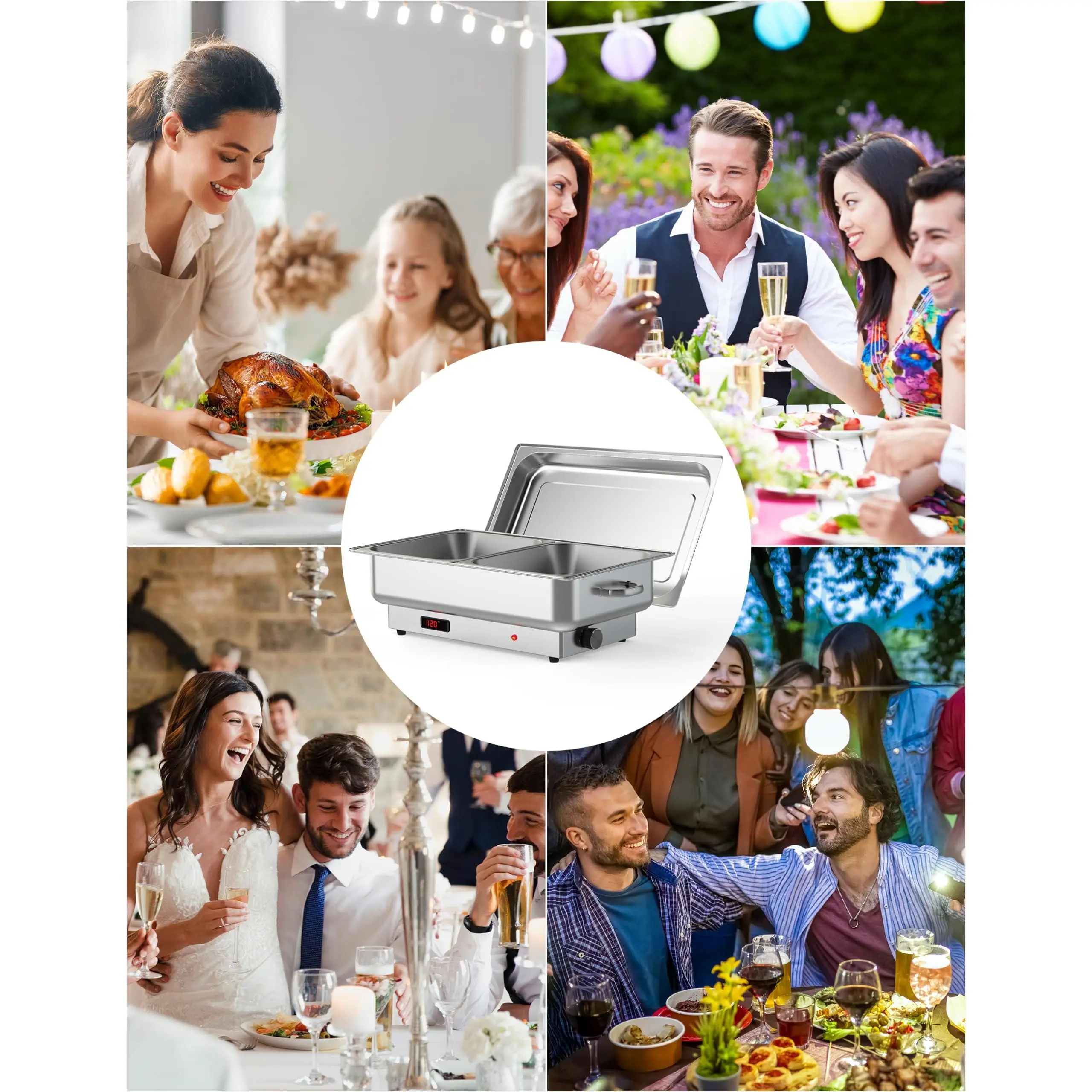 The electric chafing dishes are suitable as food warmers for parties, buffet servers, and warmers for catering events, restaurants, hotels, holiday gatherings, wedding brunches, etc.