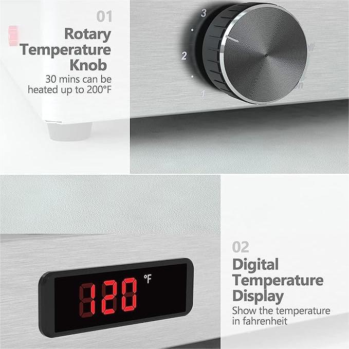 Powered by 400W heating element , it adjusts between 86Β°F and 200Β°F (30Β°C and 93Β°C) for efficient food service.