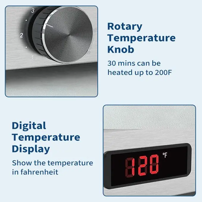 Powered by 400W heating element , it adjusts between 86°F and 200°F (30°C and 93°C) for efficient food service.
