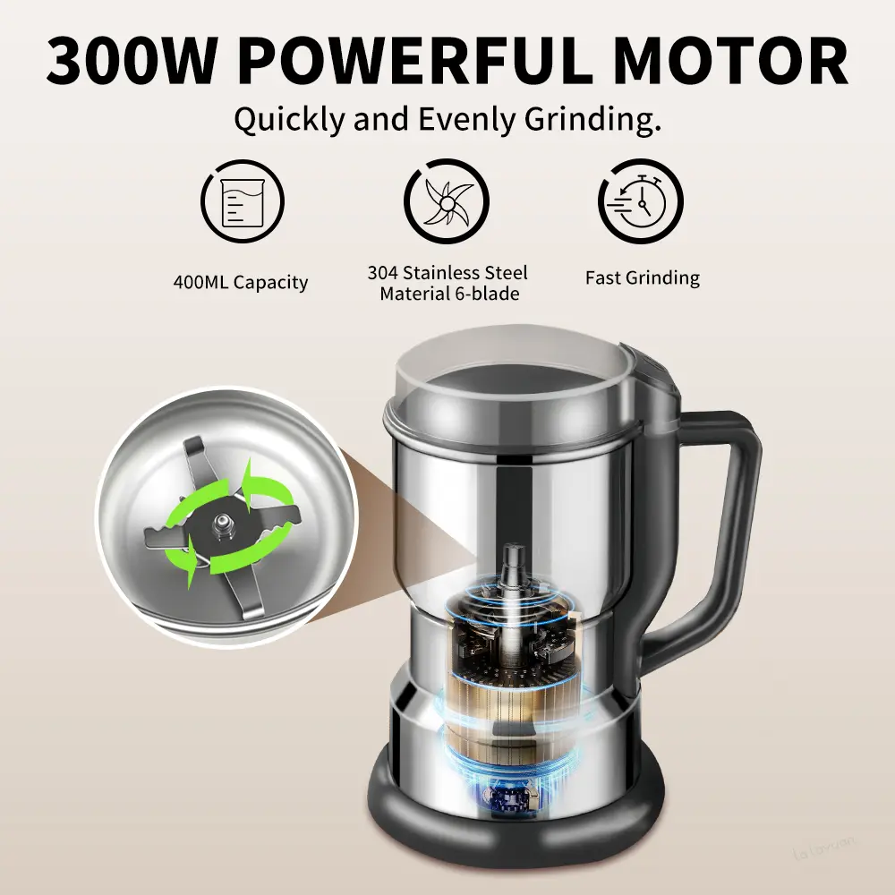 Electric Coffee Grinder Multifunctional Coffee Bean SpiceBeans Vanilla Stainless Steel Mixer 300W High PowerCrusher coffee grinder Electric Coffee Stainless SteelMeasuring Pitcher with Lid Espresso Distribution Tool withStand fast grind