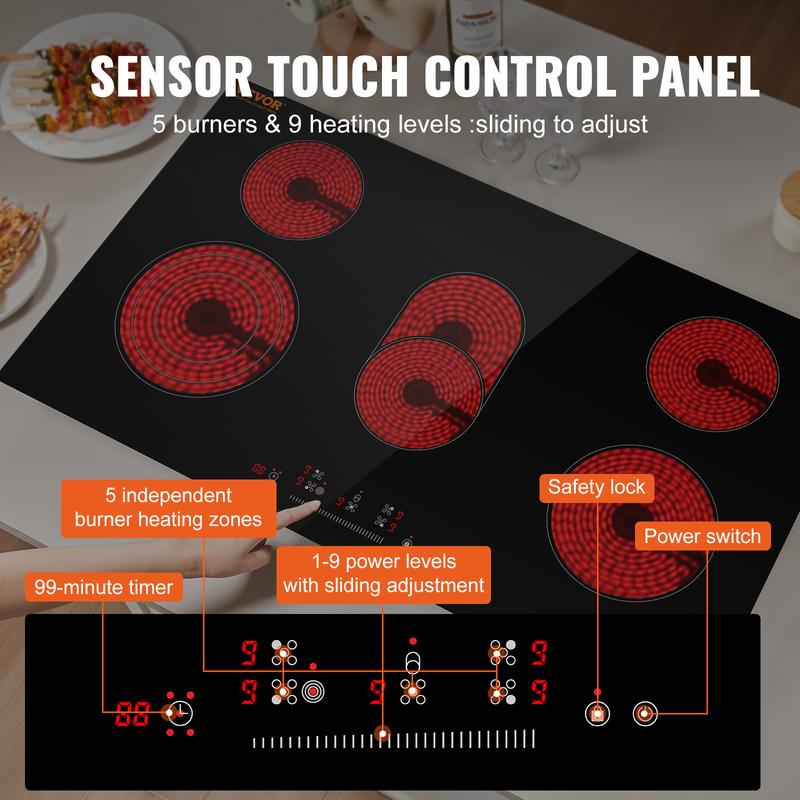 • 5 Burners for Multi-Pot Cooking: The stovetop electric cooktop is compatible with various high-temperature cookware, including copper pots, cast iron skillets, and stainless steel pots. The 5 burners enable efficient simultaneous cooking, with reduced heat loss and enhanced heating efficiency.