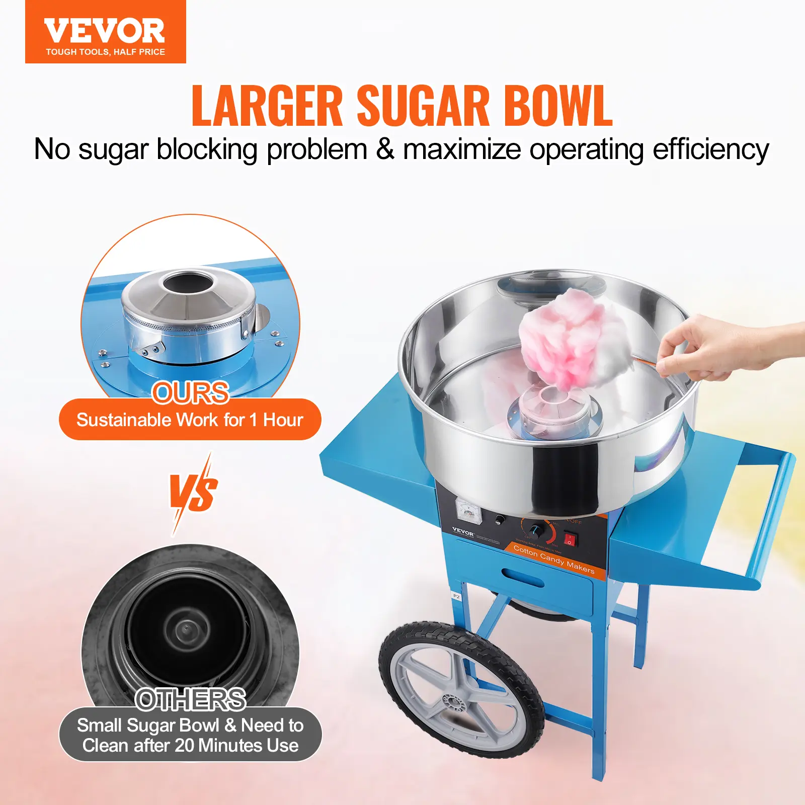 • Work with Any Candy You Like: This cotton machine allows you to use the traditional flossing sugars, milk sugars, fruit cubes, or any of your favorite hard candies to make delicious cotton candies. Large wheels and sturdy handle facilitate movement, and it is perfect for carnivals, festivals, birthday parties, and sports events.