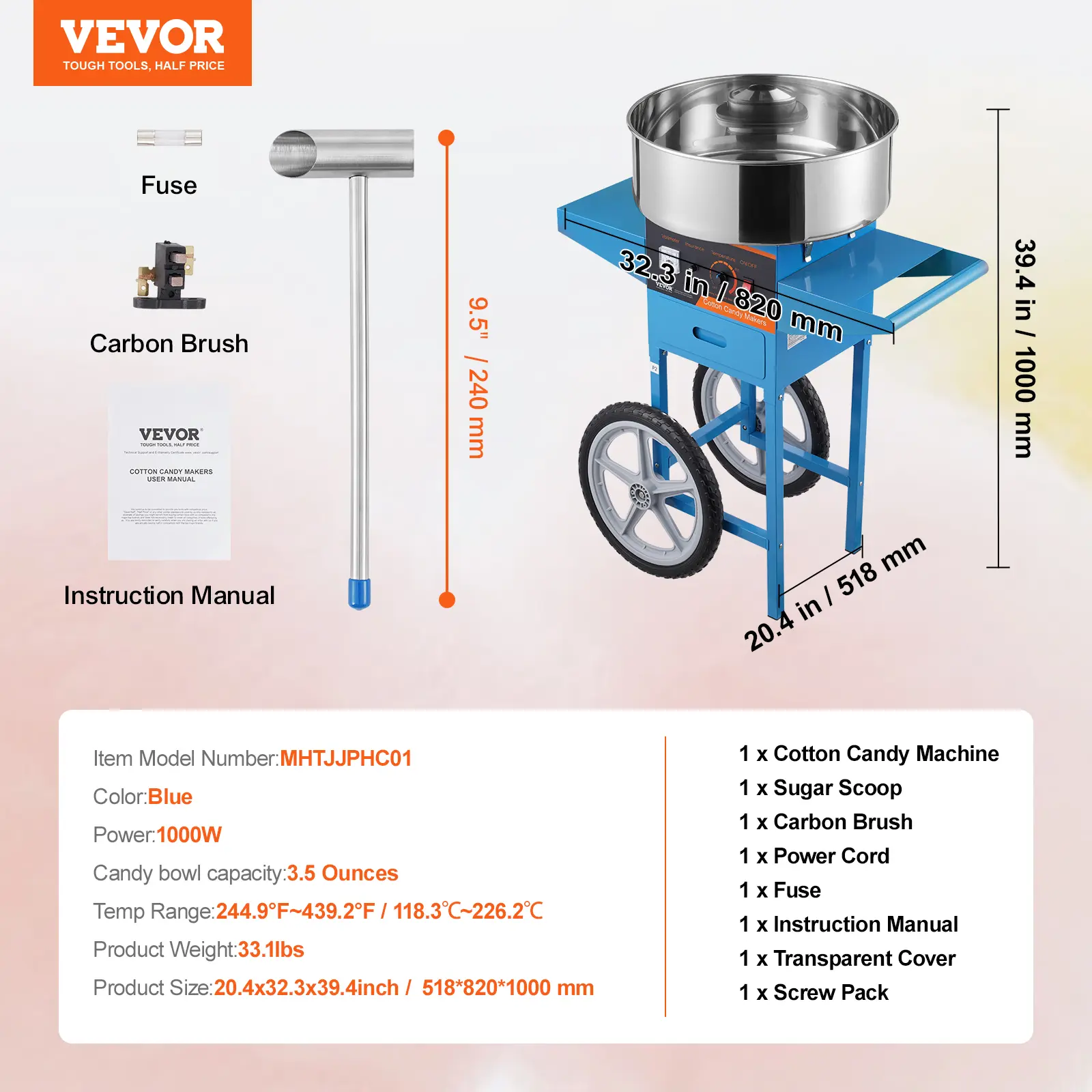 • Temp Control: Unlike the common ones, our electric candy floss maker features a voltage meter and a temp control knob. By changing voltage, you can simply adjust the temperature from 244.9°F/118.3℃ to 439.2°F/226.2℃. If you want to try different flavored sugars, you will absolutely need this.