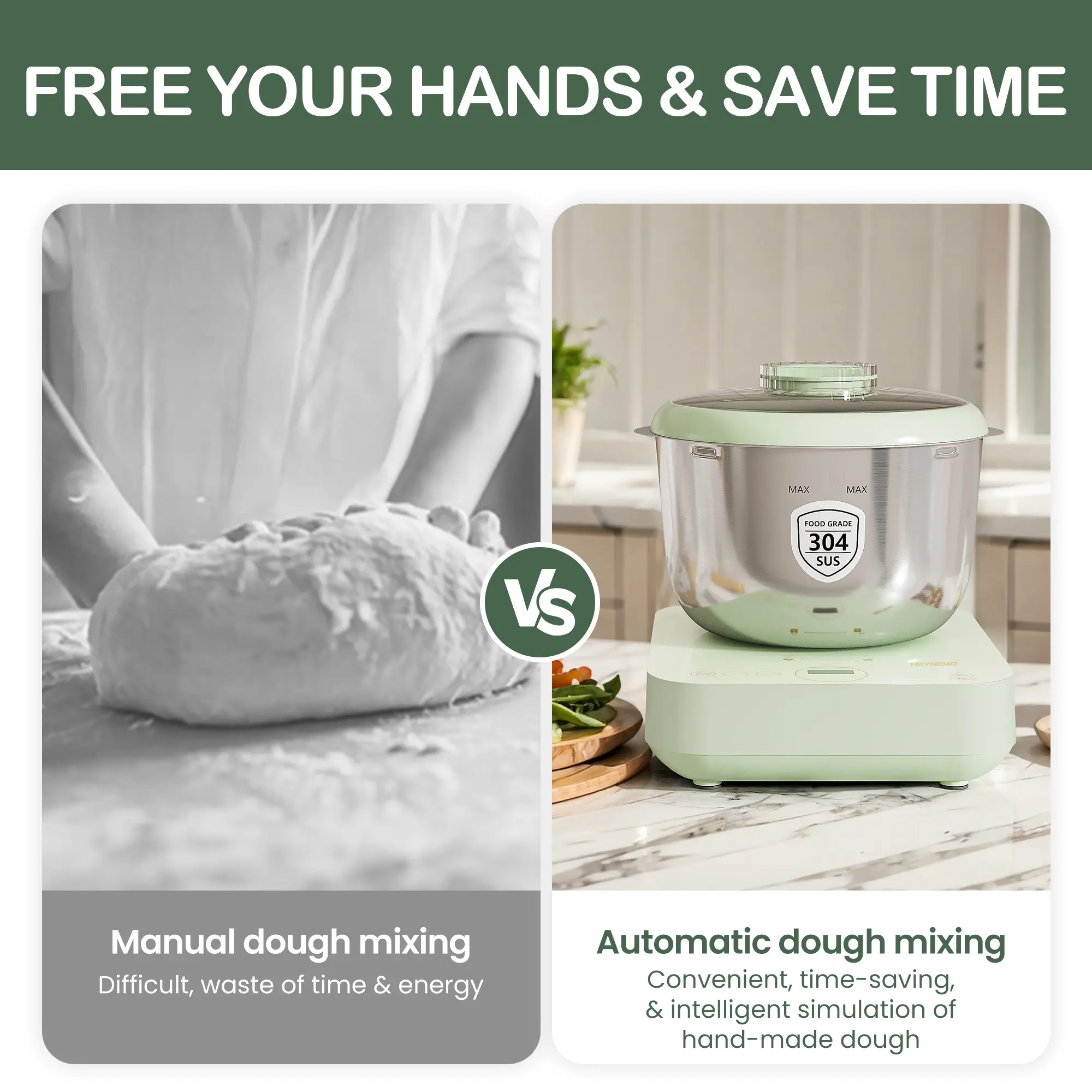 Large Capacity 🍞- 5.2qt Capacity: Ideal for preparing large batches of bread, pizza, buns, and dumplings.- Adjustable Kneading Time: With countdown settings, efficient dough preparation is completed within 15 minutes, meeting the needs of busy bakers.