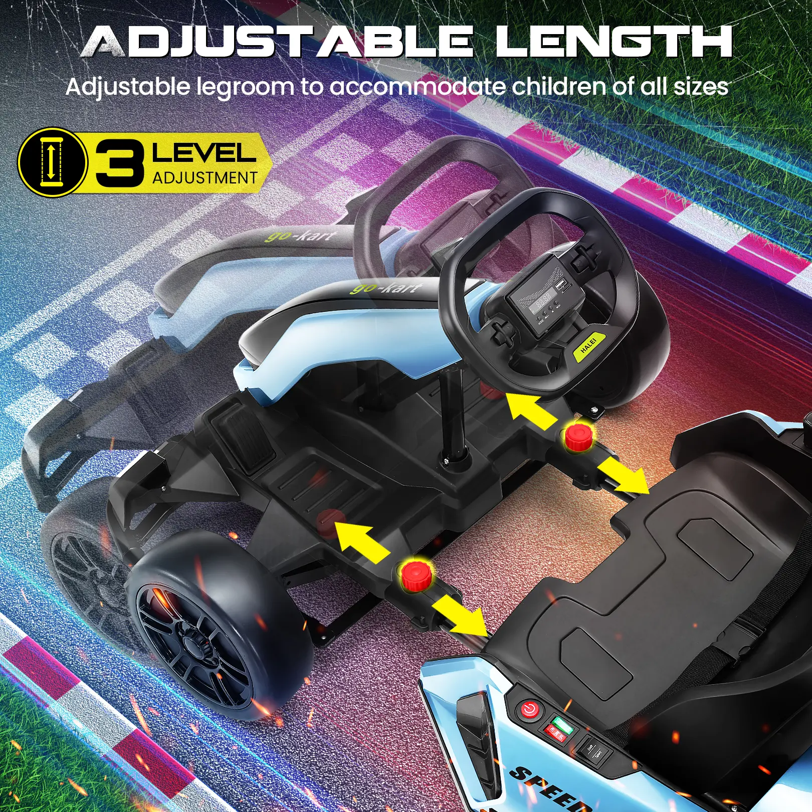 ·Grows With Your Child: 3-stage adjustable seat (20.75" to 26.5") accommodates ages 6-12. There is a length adjustment button on the car body, the car's length can be adjusted according to the height of your kids. (supports up to 110lbs).