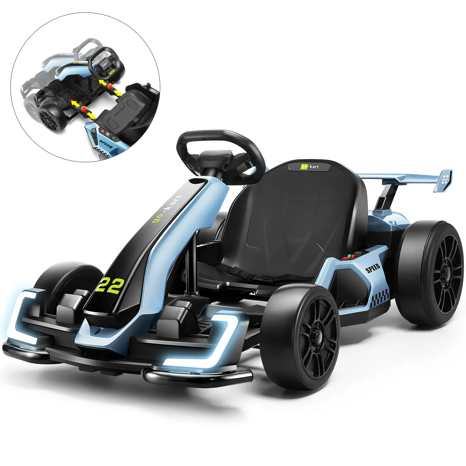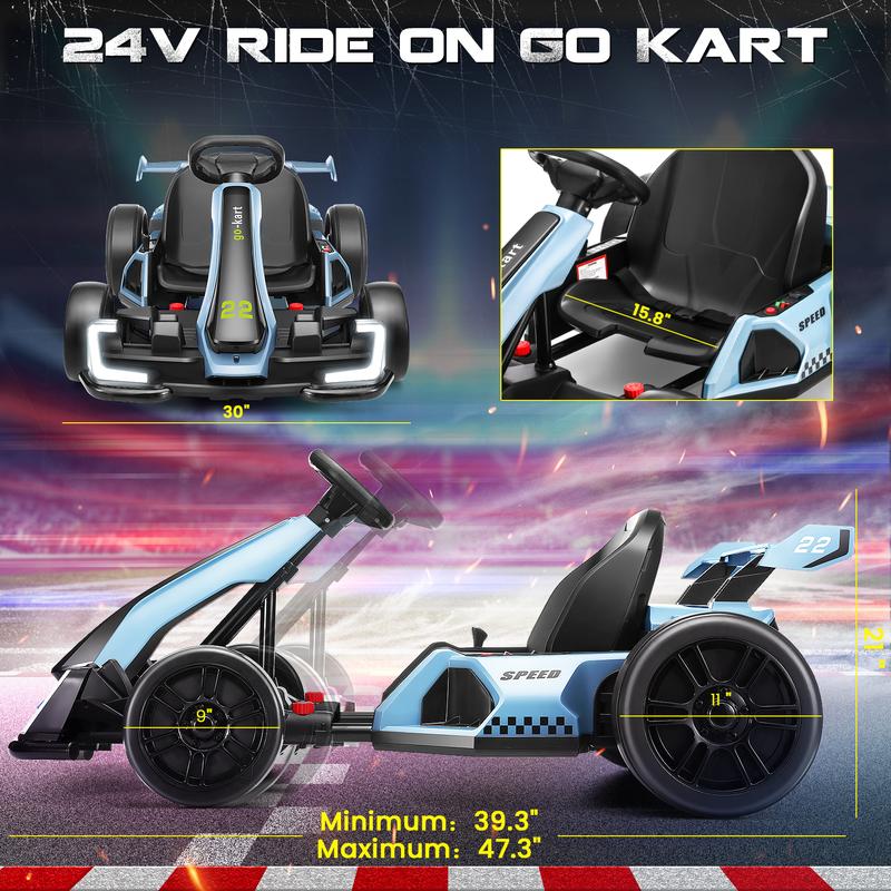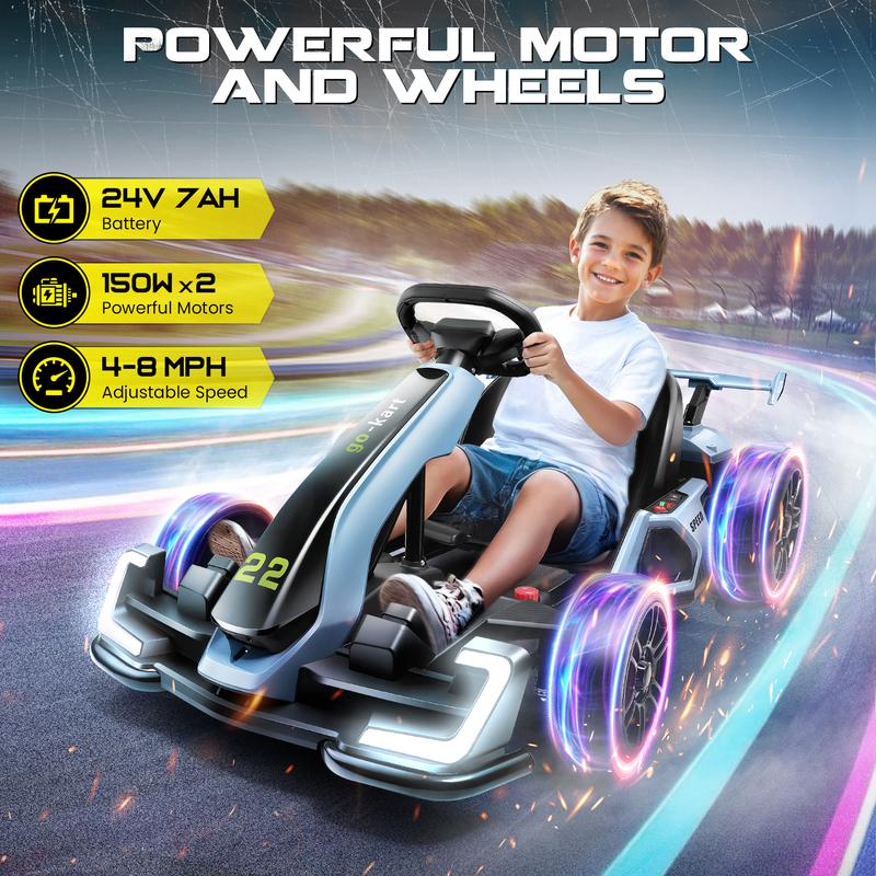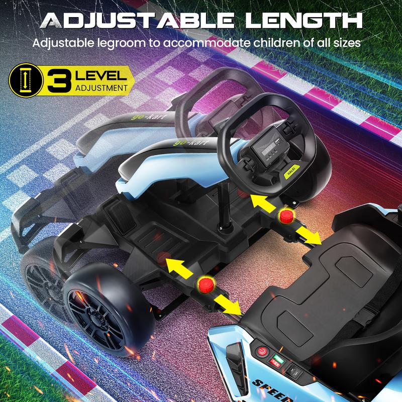 ·Dual-Mode Drift Pro: 24V 300W high-torque motor delivers real drifting action with 8.5MPH top speed. Choose between Sport/Drift modes (High & Low speeds), ideal for pavement or grass terrain (1-2-hour runtime at full load)