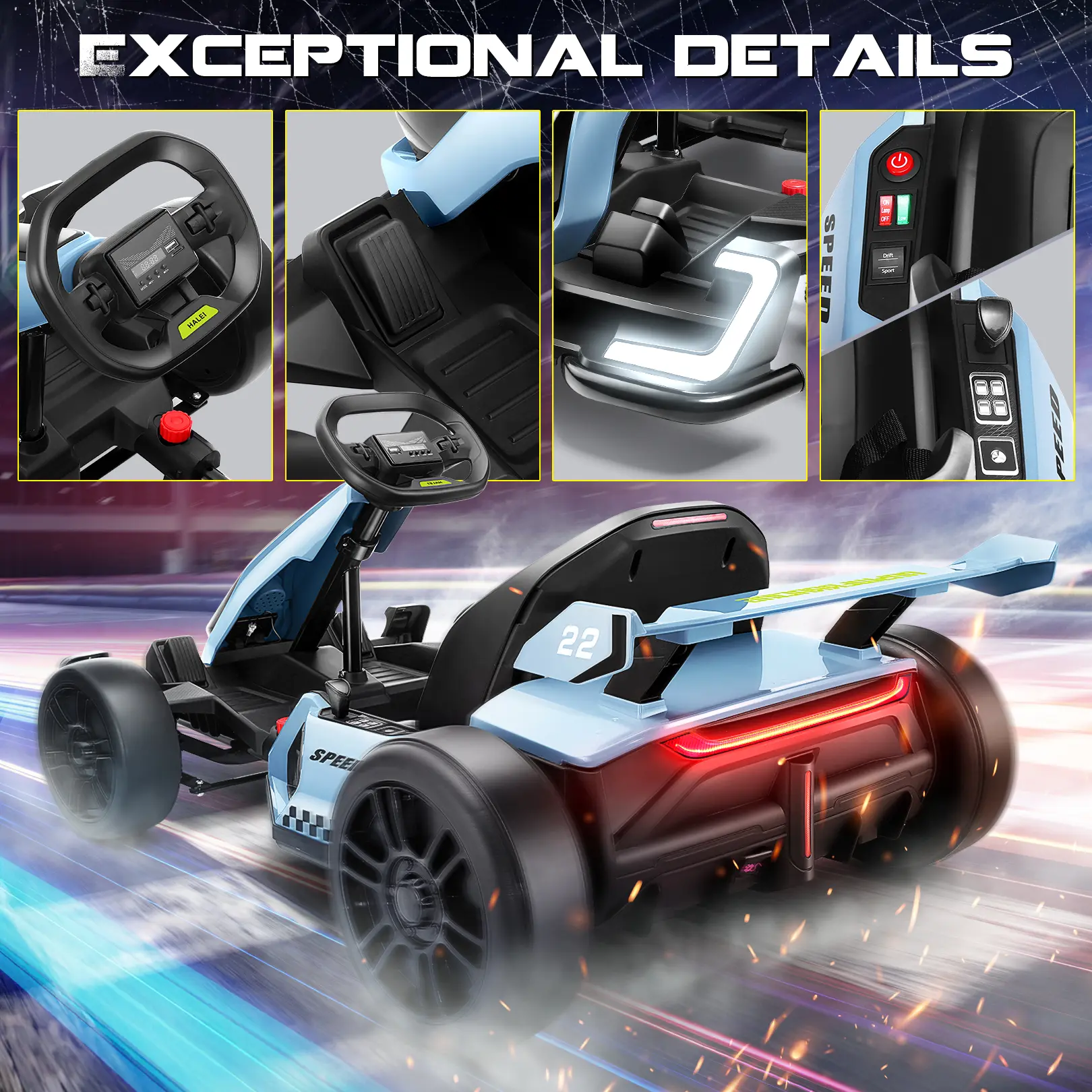 ·Comprehensive Safety Features: Reinforced steel frame with 3-point seatbelt, emergency brake, and 4 EVA tires. Specially designed low center of gravity prevents rollovers during sharp turns
