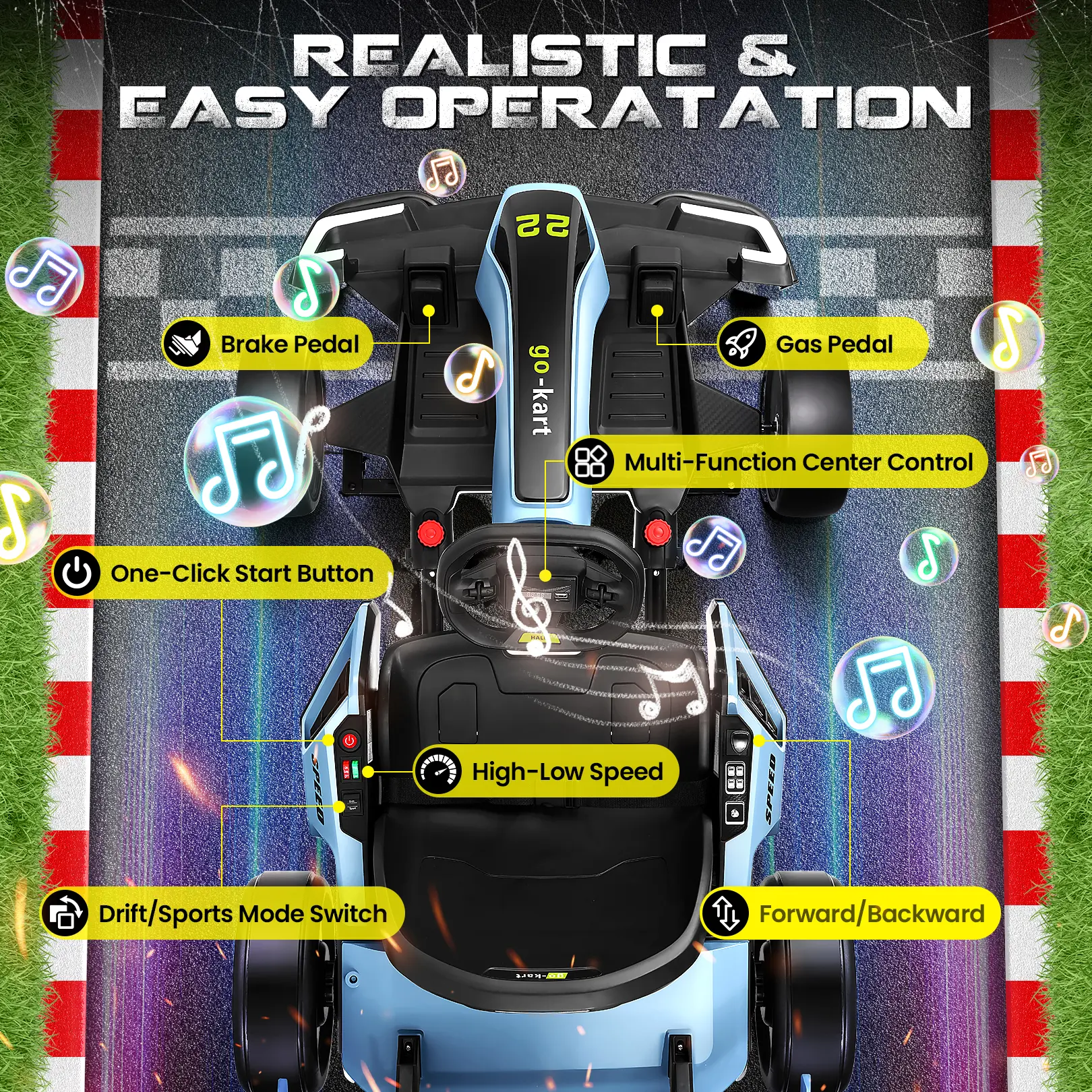 ·Multi-Function System: Built-in speakers with Bluetooth/FM/USB/AUX connectivity for music, stories and realistic engine sounds, creating exciting racing thrills! Smart battery display ensures timely charging.