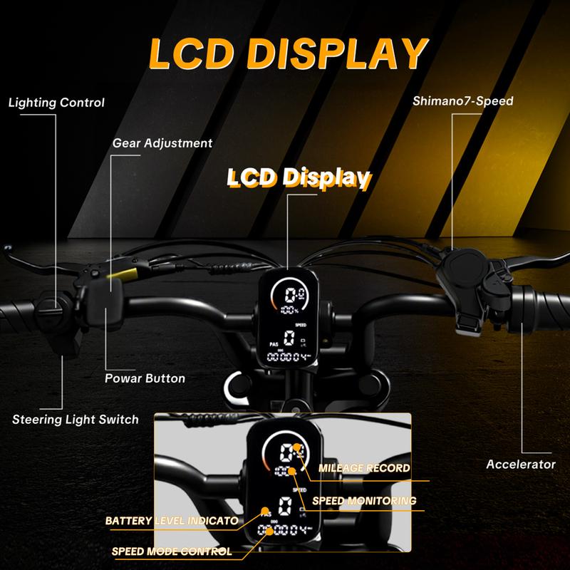 Stay informed with the center-mounted LCD display, showing speed, battery level, mileage, and more. Features include LED headlight with horn, turn signal taillight, and mechanical brake cut-off, enhancing visibility and safety during night rides.